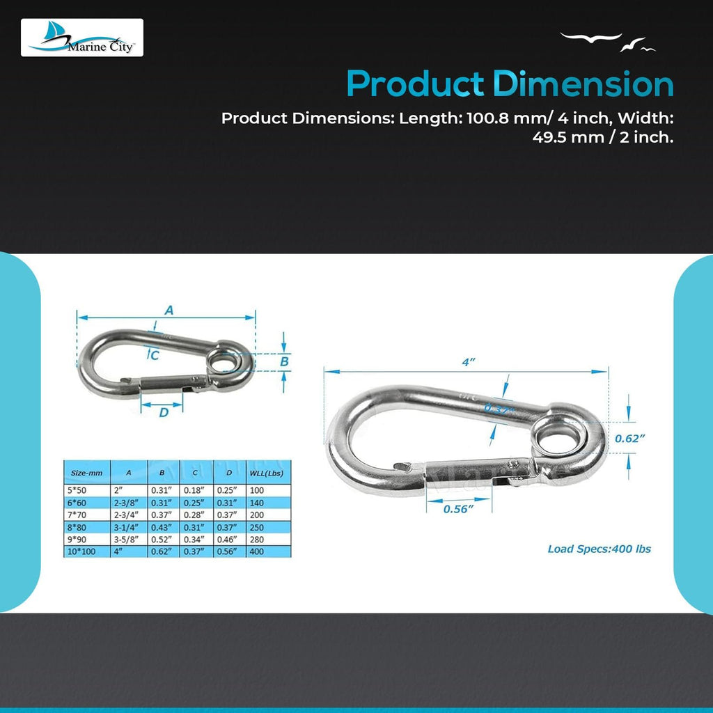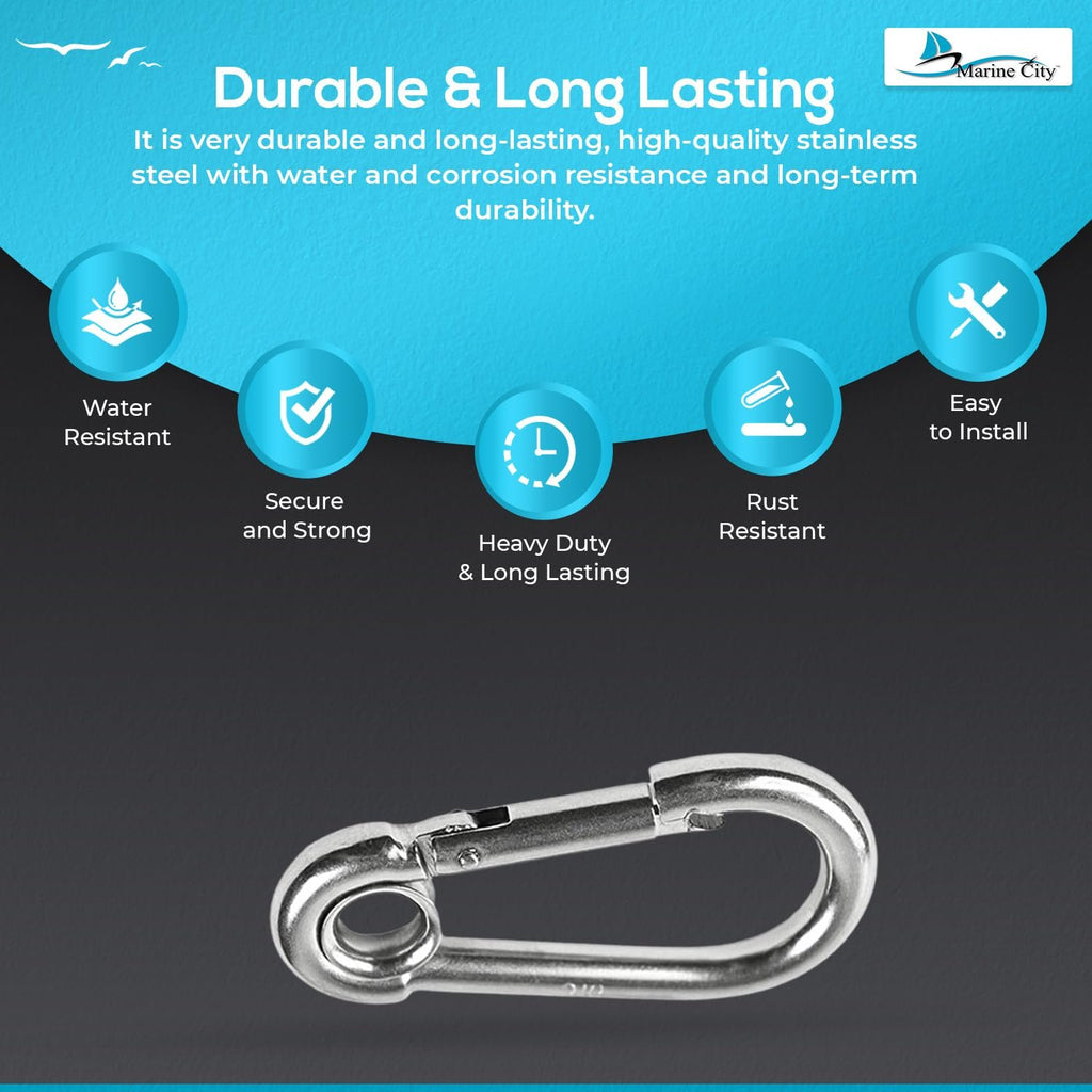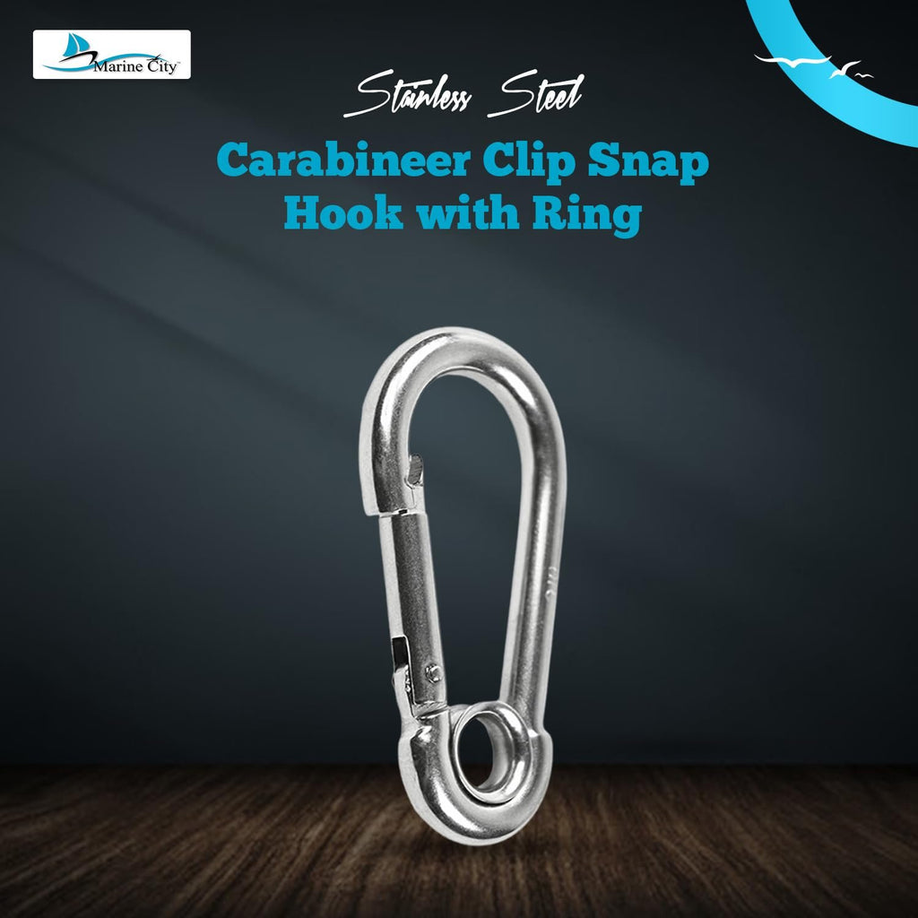 The Marine City 316 Stainless Steel Carabiner Clip Snap Hook with Ring is designed for strength, durability, and versatility in marine and outdoor environments. Constructed from premium 316 marine-grade stainless steel, it resists corrosion, rust, and seawater erosion, making it ideal for climbing, hiking, boating, fishing, sailing, camping, and everyday tasks.