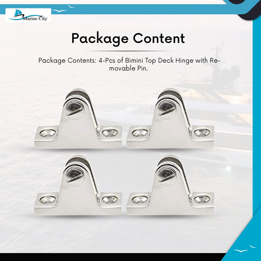 The MARINE CITY 316 Stainless Steel Bimini Top Deck Hinge with Removable Pin (4 Pcs) is designed to provide a secure, durable, and corrosion-resistant mounting solution for Bimini top frames in marine environments.