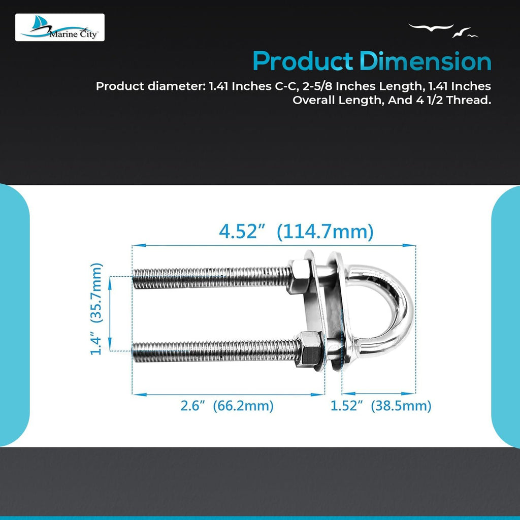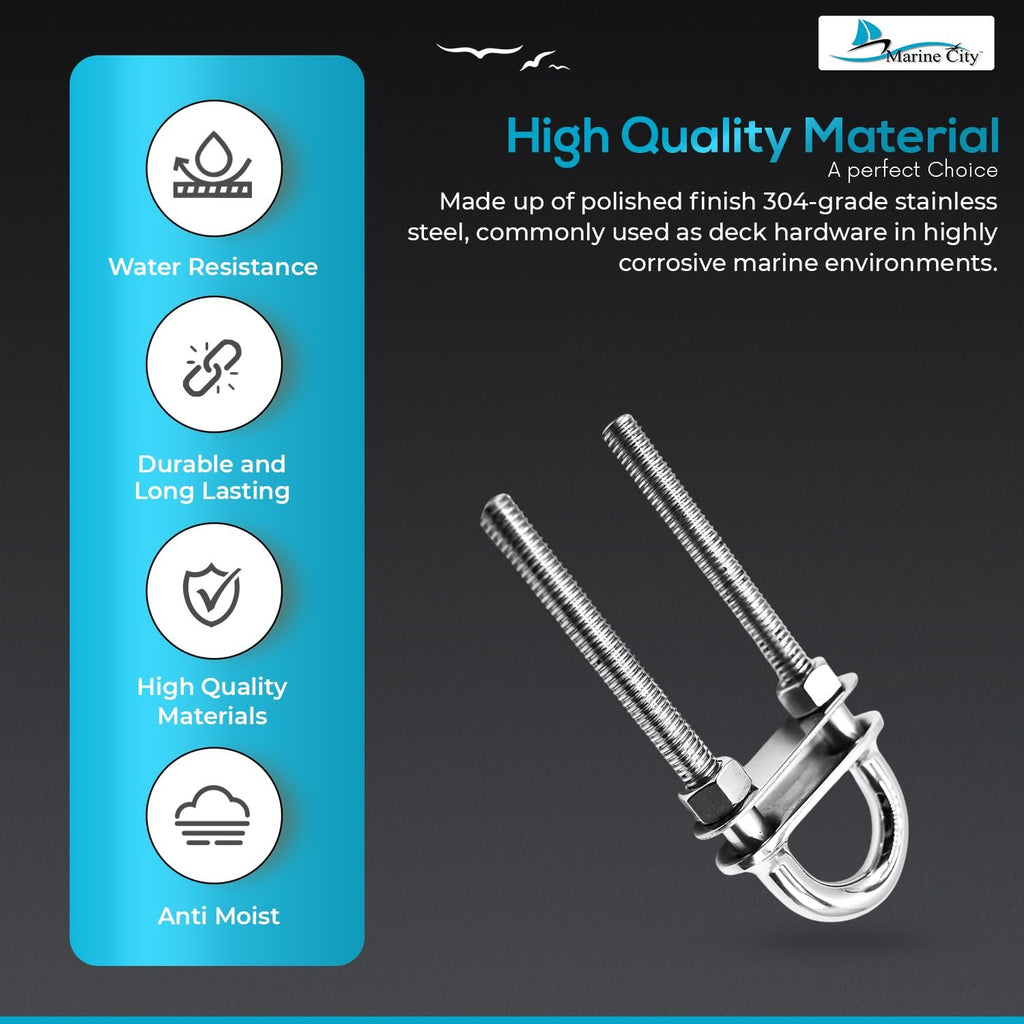 The Marine City Stern Bow Eye Tie Down U-Bolt (4.5") is engineered for strength, durability, and long-term performance in demanding marine environments. Constructed from bright polished 304-grade stainless steel, this U-bolt offers excellent resistance to rust and corrosion while maintaining a clean, professional appearance.