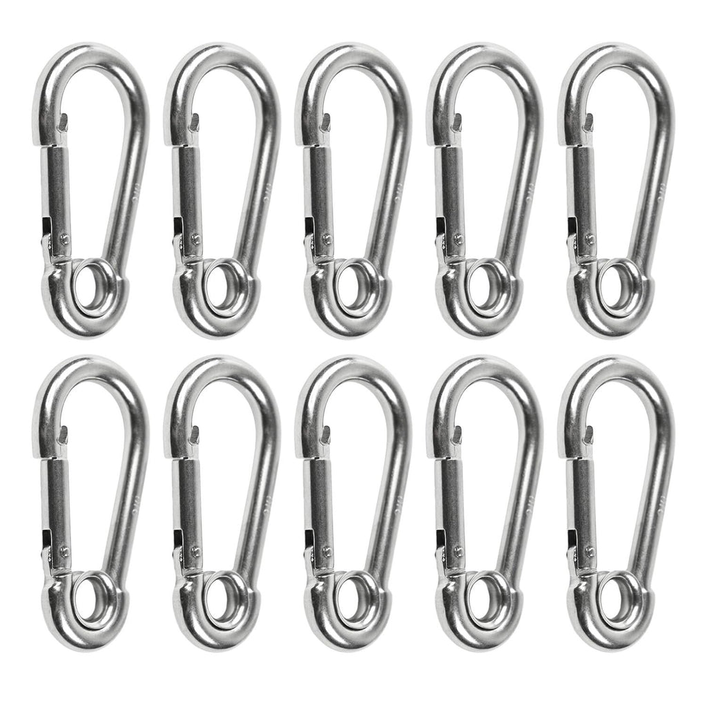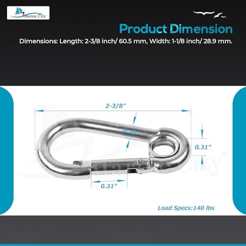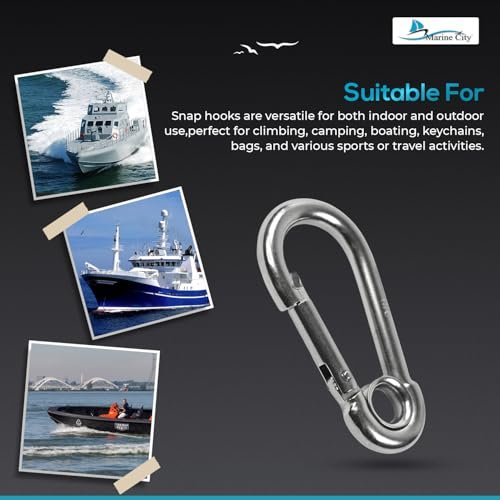 With a practical 2-3/8 inch (60.5 mm) size, these heavy-duty snap hooks are perfect for climbing, boating, sailing, fishing, camping, hiking, travel, sports, backpacks, keychains, belts, and purse straps. Reliable, economical, and built to last, this Marine City stainless steel carabiners delivers premium quality and performance for both indoor and outdoor use.