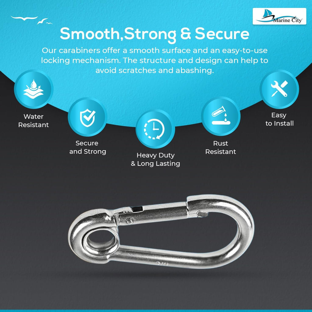 The Marine City 2-Inch Carabiner Clip Snap Hook with Ring is engineered for strength, durability, and versatility in demanding marine and outdoor environments. Made from 316 marine-grade stainless steel, these carabiners are completely rustproof, corrosion-resistant, and designed to withstand seawater exposure all year round.