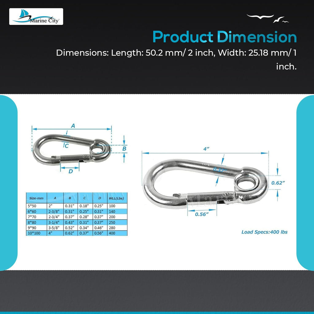 The Marine City 2-Inch Carabiner Clip Snap Hook with Ring (Pack of 10) is engineered for strength, durability, and versatility in demanding marine and outdoor environments. Made from 316 marine-grade stainless steel, these carabiners are completely rustproof, corrosion-resistant, and designed to withstand seawater exposure all year round.