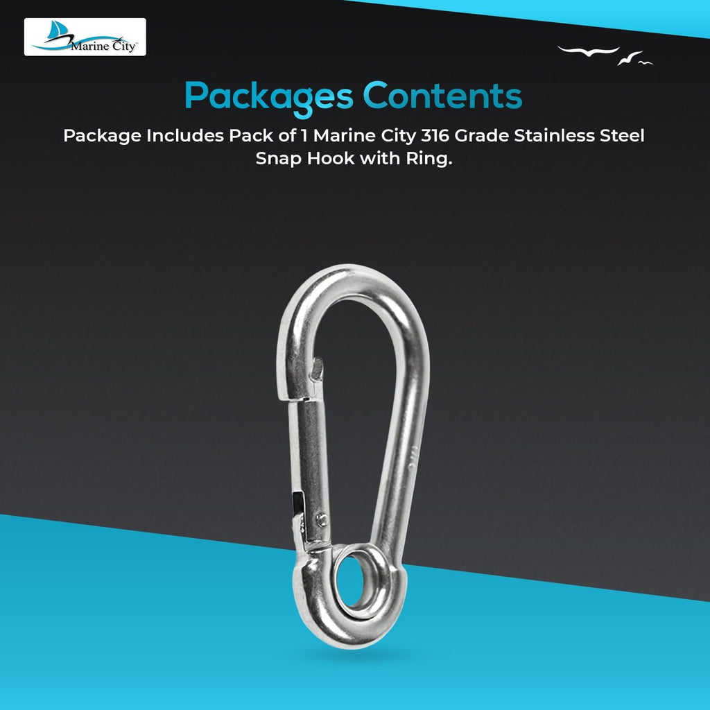 The Marine City 4-Inch Carabiner Clip Snap Hook with Ring is engineered for strength, durability, and versatility in marine and outdoor environments. Made from 316 marine-grade stainless steel, this snap hook is completely rustproof, corrosion-resistant, and designed to withstand constant exposure to seawater and harsh weather conditions.