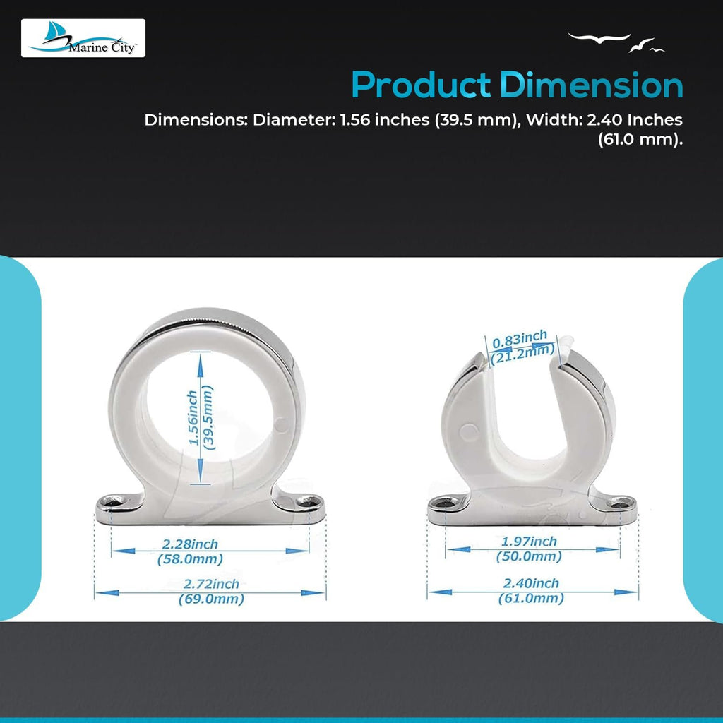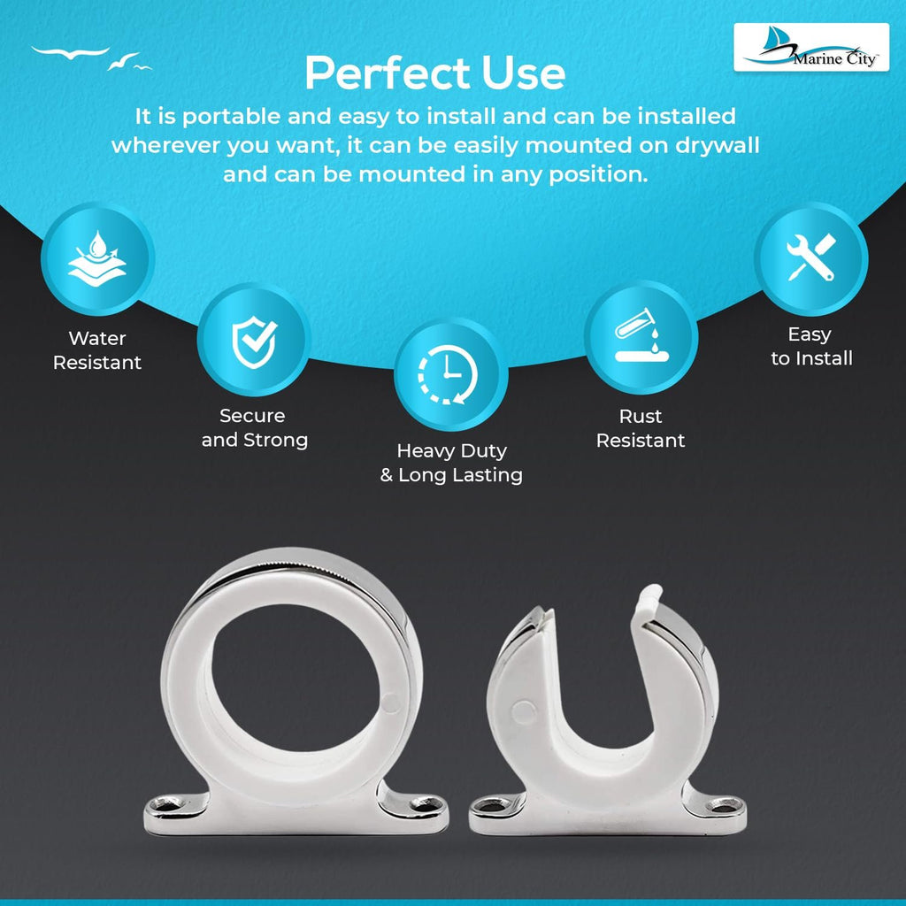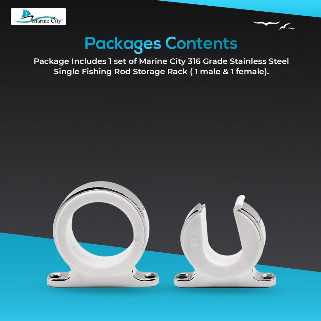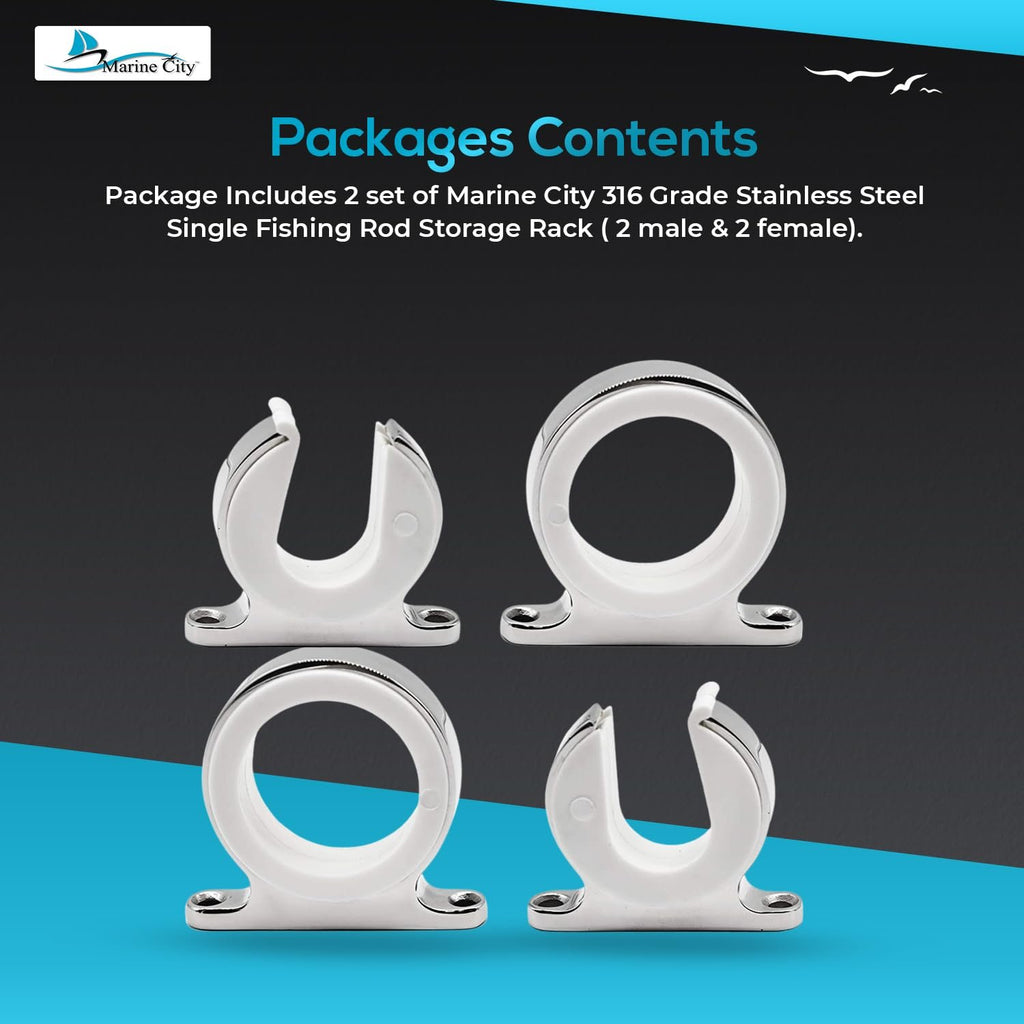 This set includes: Marine City 316 Stainless Steel Single Fishing Rod Storage Rack (1 male and 2 male & 1 female and 2 female). Keep your rods safe, organized, and ready for use, whether on a boat, yacht, or in your marine storage area.