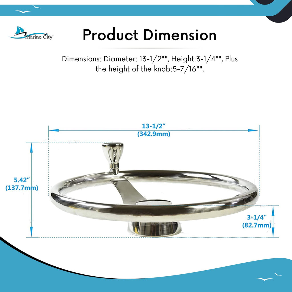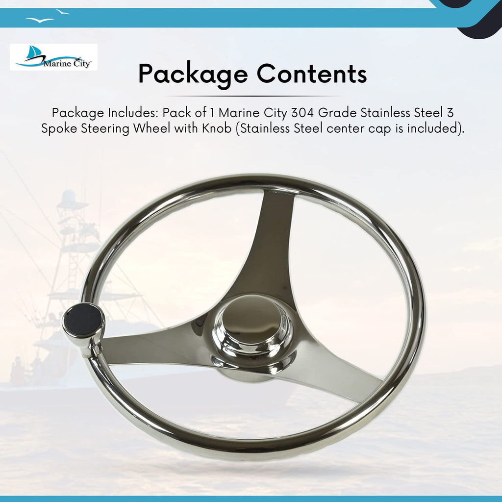 The MARINE CITY 304 Stainless Steel 3-Spoke Steering Wheel with Knob combines classic marine styling, comfortable handling, and long-lasting durability. Constructed from high-quality marine-grade 304 stainless steel, this steering wheel is polished to a bright mirror finish, providing reliable corrosion resistance and a smooth, professional appearance at the helm.