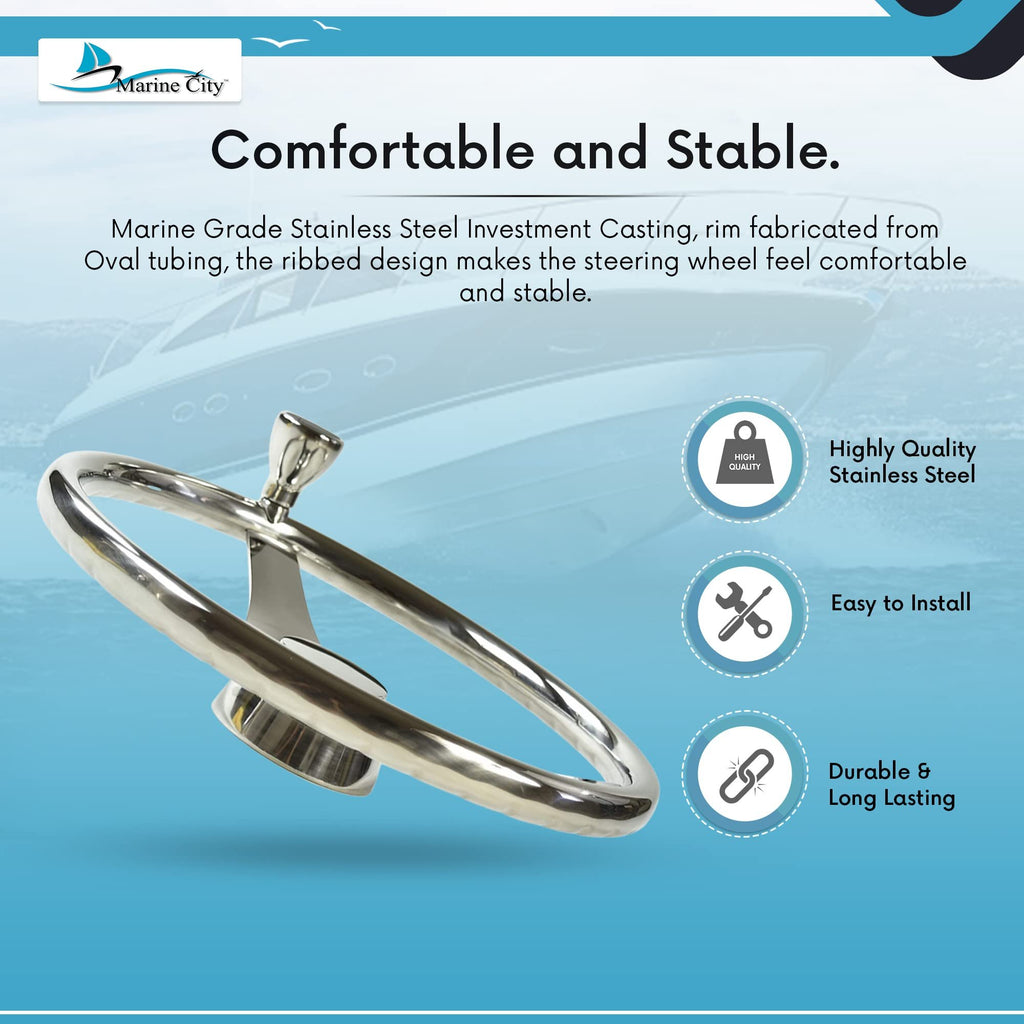 Designed for easy installation with no modification required, the MARINE CITY steering wheel is ideal for boats, yachts, ships, and other marine applications, delivering dependable performance and timeless stainless steel craftsmanship.