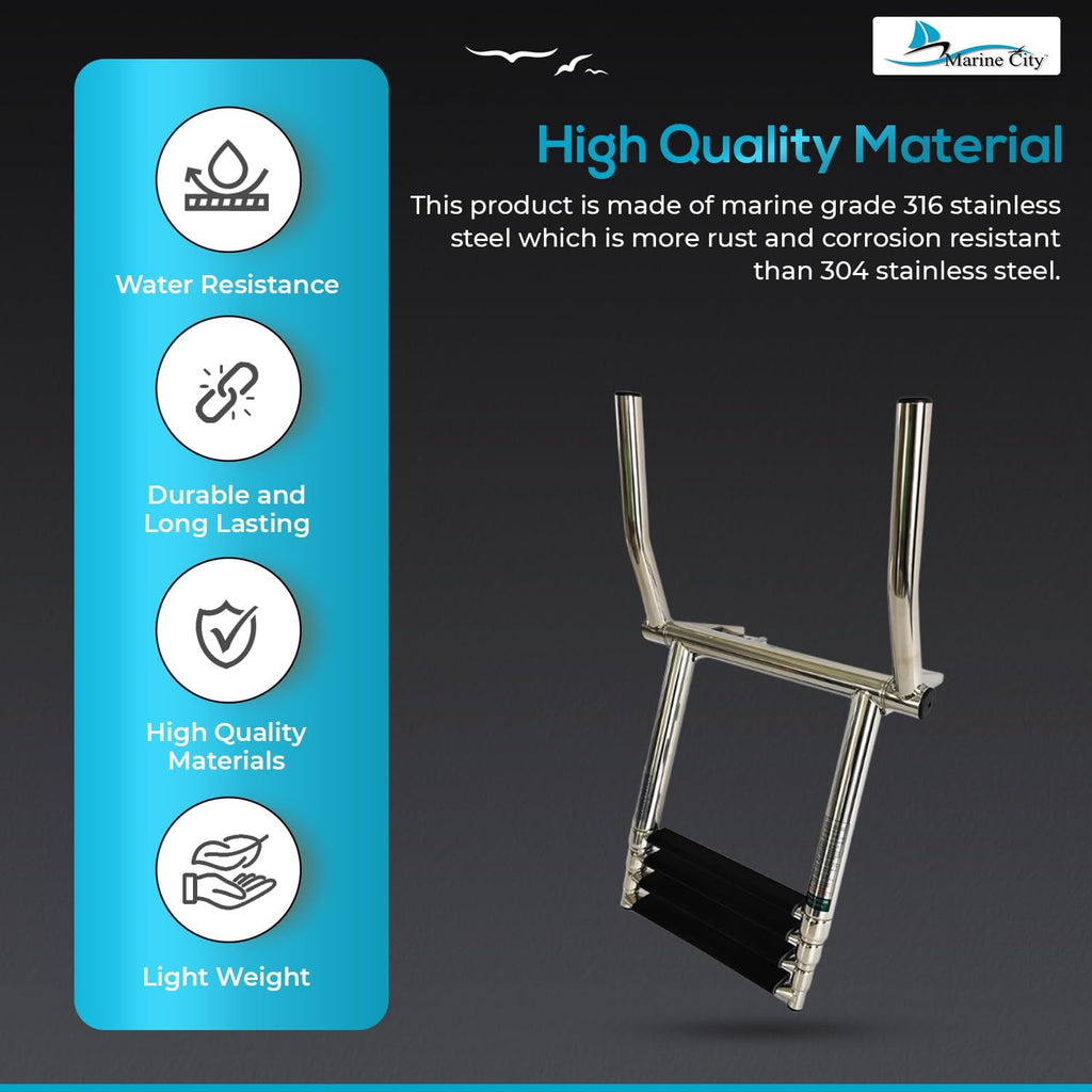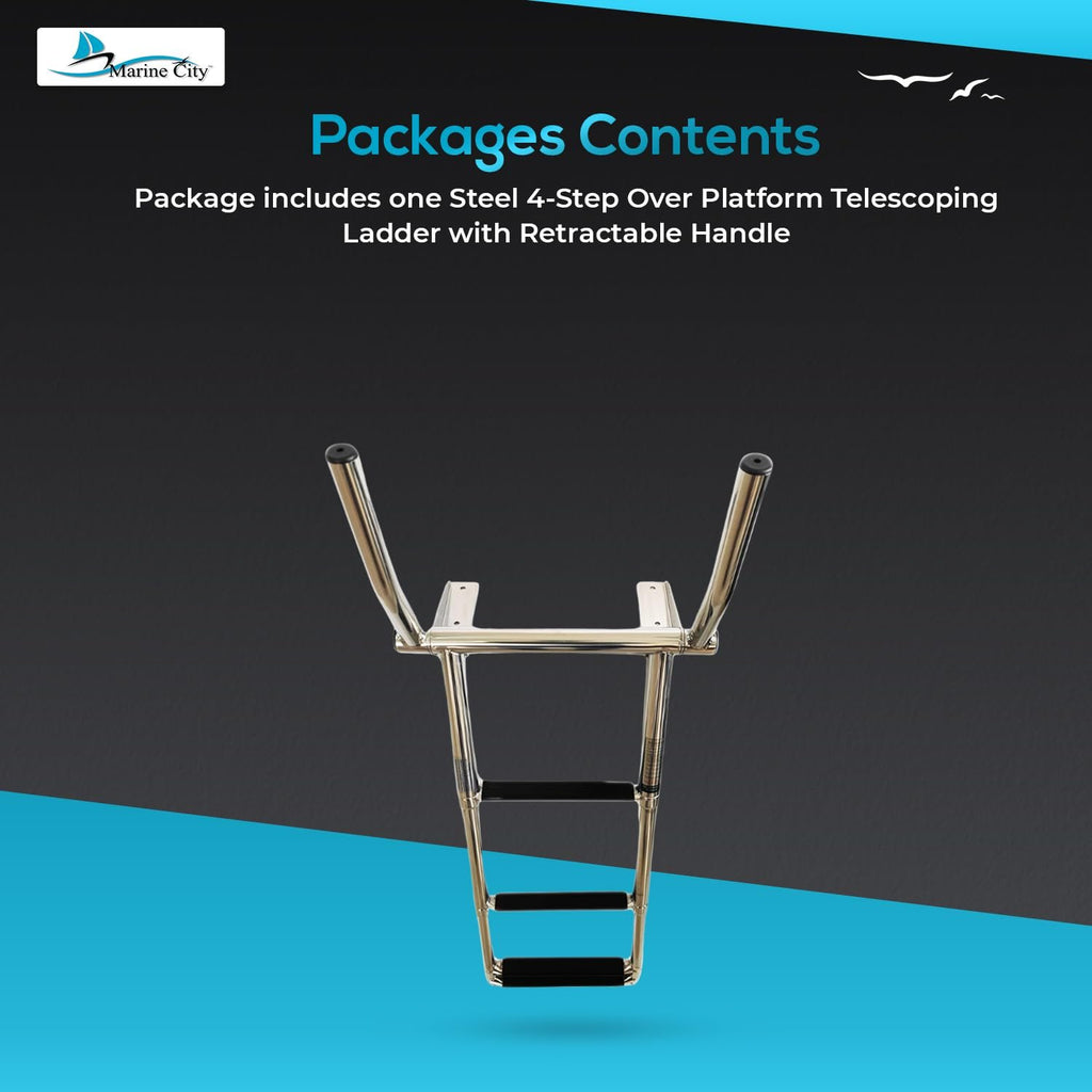The Marine City 316 Grade Stainless Steel 3-Step Over Platform Telescoping Ladder with Retractable Handle is designed for maximum safety, durability, and ease of use in demanding marine environments. Manufactured from marine-grade 316 stainless steel, this ladder offers superior resistance to rust and corrosion compared to standard 304 stainless steel, making it ideal for saltwater use.
