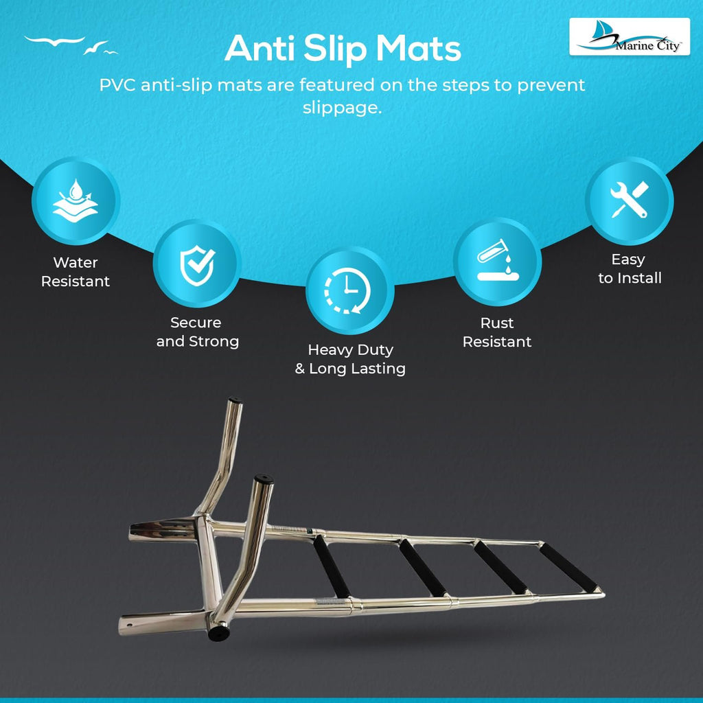 Each step features PVC anti-slip mats, providing secure footing when boarding or exiting your boat. The ladder undergoes four polishing stages plus a final touch-up polish, resulting in a smooth mirror-finish surface that enhances both appearance and corrosion resistance.