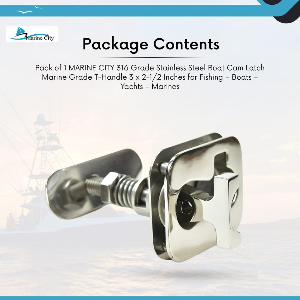 The Marine City 316 Stainless Steel Boat Cam Latch – T-Handle, 3 x 2-1/2 Inches is a premium marine hardware solution designed for hatches, lockers, live wells, and other marine compartments. Constructed from marine-grade 316 stainless steel, this latch offers maximum corrosion resistance, rust-proof performance, and long-term durability even in harsh, saltwater environments.