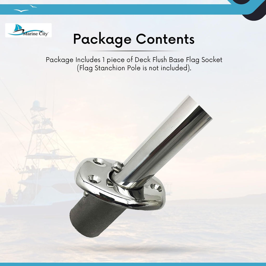 About Us Here at Marine City Hardware, we specialize in marine hardware products. We are all family and are all working together to bring our customers exactly what they need. Our motto is high quality, low prices, fast shipping, and taking care of our customers. Everything is double-checked and electronically tested before being sent out to ensure the highest quality. Our company provides retail and wholesale services so you may also contact us if you want to order our products in bulk as well. Our exceptional prices and superior manufacturing company make us the best around for any marine products. 100% Customer Satisfaction is our ultimate goal so we encourage you to message us because we will work for you. Feature • Made of superior corrosion-resistant electro polished mirror polished 316 stainless steel • Angled Socket inserts nearly flush to the deck , Suitable for Ø 0.79 Inches(20.0mm) Flag Stanchion Pole or Bait/Filet Mate tray Mount bracket • Package contents: 1 pc Deck Flush Base Flag Socket, (Not include Flag Stanchion Pole).