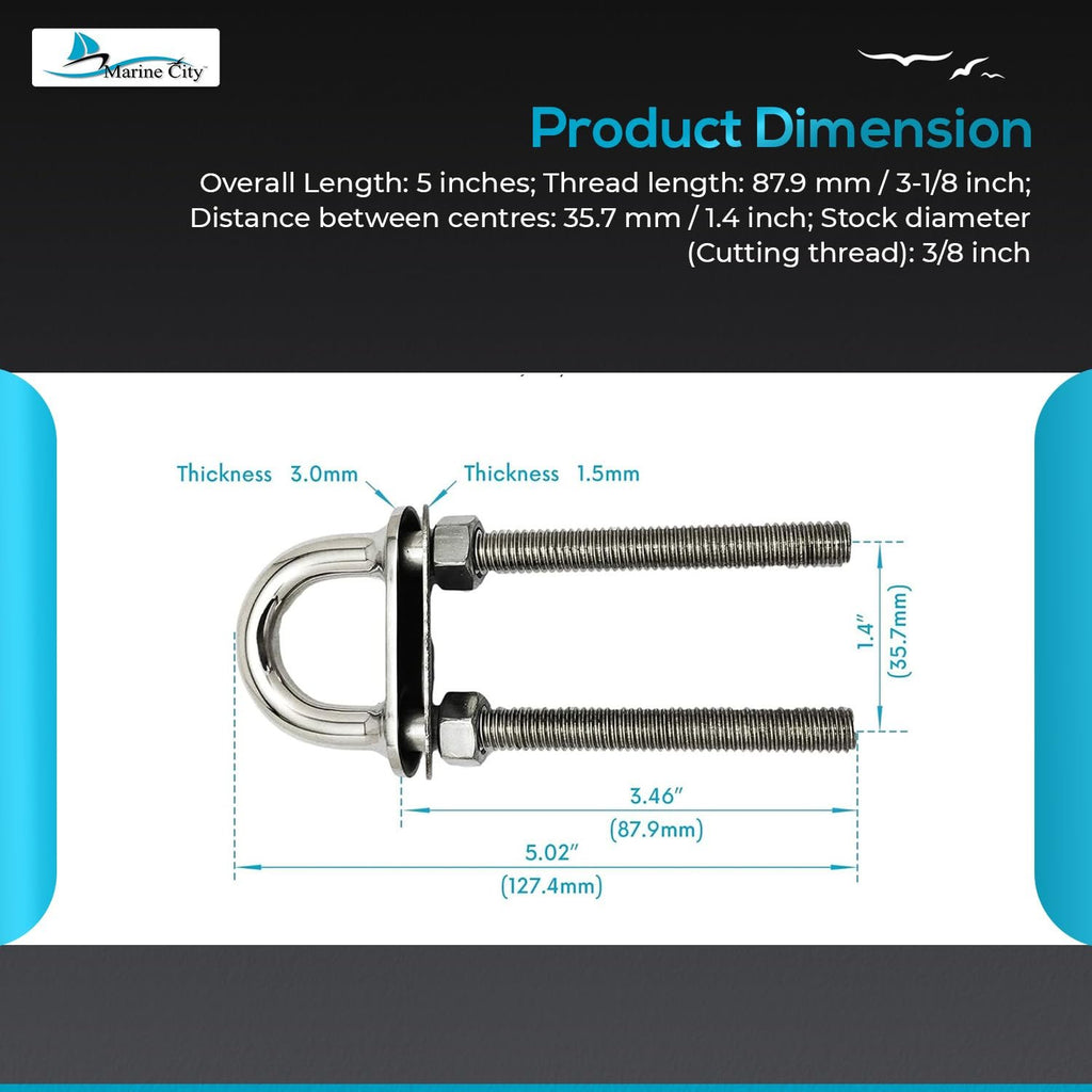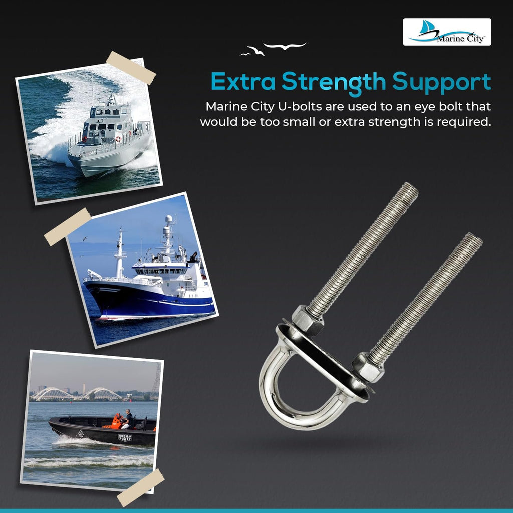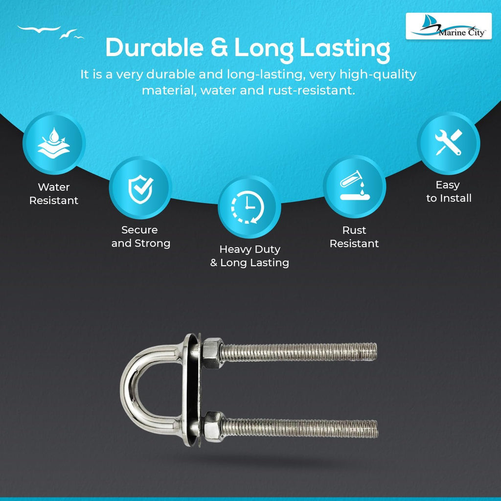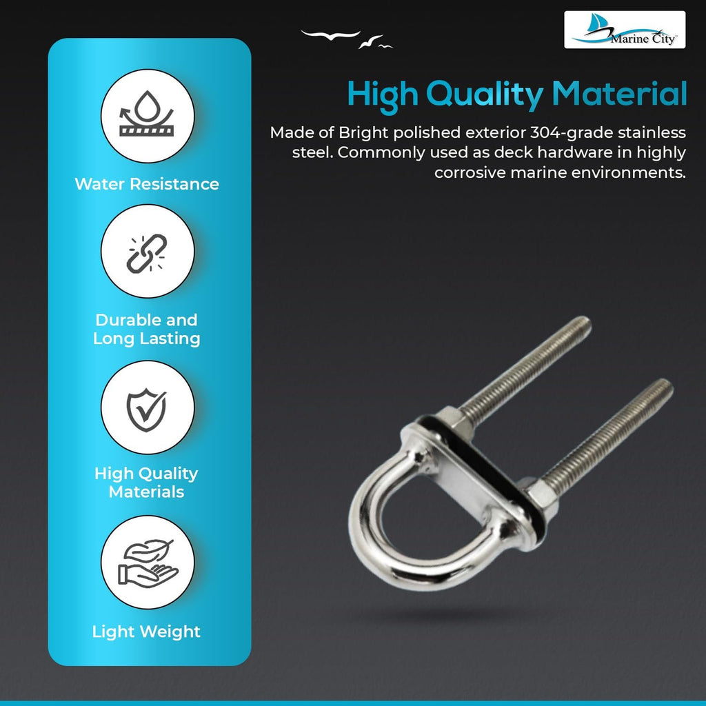 The Marine City 3/8" Bow Eye U-Bolt with Welding Plate (5") delivers maximum strength and corrosion resistance for demanding marine applications. Crafted from bright mirror-polished 304-grade stainless steel, this bow eye is commonly used as deck and hull hardware on boats, yachts, and marine vessels.
