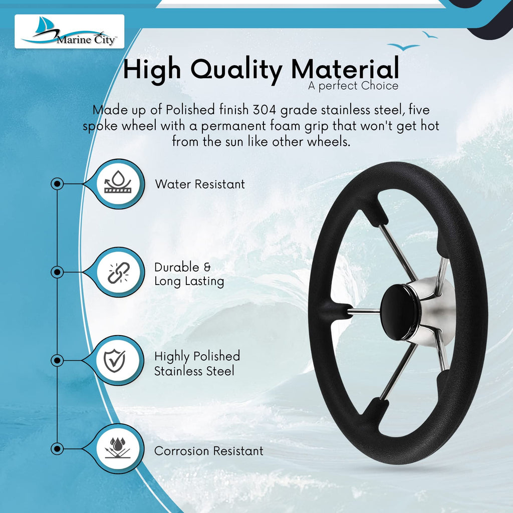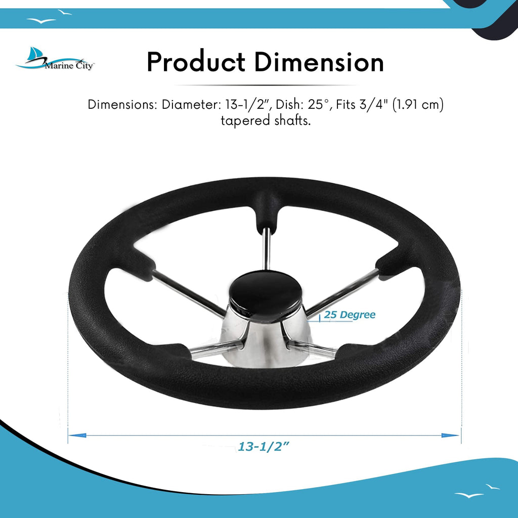 About the Brand Here at Marine City Hardware, we specialize in marine hardware products. We are all family and are all working together to bring our customers exactly what they need. Our motto is high quality, low prices, fast shipping, and taking care of our customers. Everything is double-checked and electronically tested before being sent out to ensure the highest quality. Our company provides retail and wholesale services so you may also message us if you want to order our products in bulk as well. Our exceptional prices and superior manufacturing company make us the best around for any marine products. Feature • Five spoke wheel with a permanent foam grip that won't get hot from the sun as other wheels do. • Made of Polished finish 304-grade stainless steel. • This item Black plastic center cap is included. • Perfect for sailing, boating, and many other marines and rough weather applications. • Diameter: 13-1/2”, Dish: 25°, Fits 3/4" (1.91 cm) tapered shafts. Key Features Super Sturdy Material Polished 304 stainless steel is attractive and resists corrosion. All-welded construction is strong and sturdy. Add a distinctive look to your boat. Black Plastic Center Cap is Included Well welded and polished - 304 stainless steel construction. Five-spoke wheel with a permanent stainless steel grip that won't get hot from the sun as other wheels do."