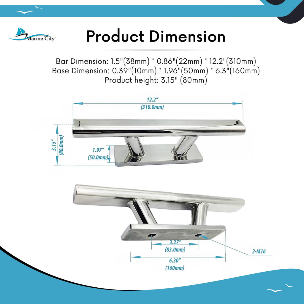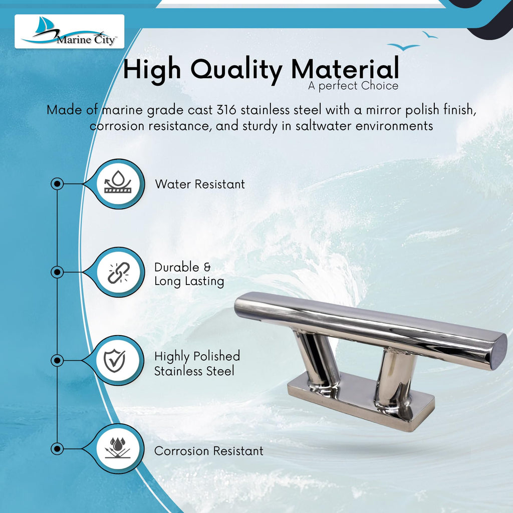 The Marine City 12-Inch Mooring Bollard Cleat with Flat Base is engineered for superior strength and long-lasting performance in demanding marine environments. Constructed from marine-grade cast 316 stainless steel, this heavy-duty cleat provides exceptional resistance to rust, corrosion, and saltwater exposure.