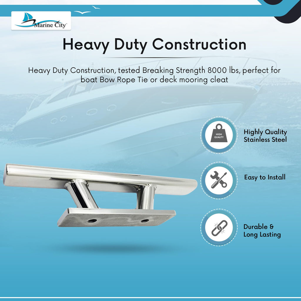 With a tested breaking strength of 8,000 lbs, this cleat is designed to secure heavy mooring lines, bow ropes, and stern docking lines with confidence. The flat base design ensures stable, flush deck mounting, making it suitable for boats, yachts, caravans, trailers, and other outdoor applications.