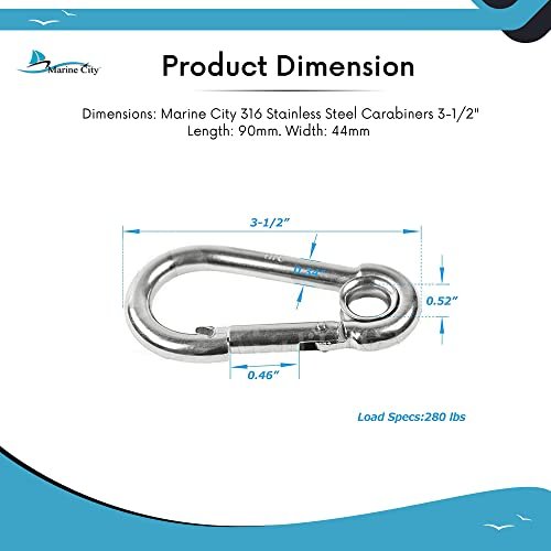 Features:-It is made of 316-grade stainless steel. Length: 89.45 mm/ 3-1/2 inch, Width: 44.5 mm / 1-3/4 inch.Perfect for sailing, boating, many other marines and rough weather applications.Great for Camping, Hiking, Fishing, Travel, Sports, Activities, Backpack, Key Ring, Keychain, Split Rings, Belt Loops, Pants Loop, Purse Straps, Briefcase, Straps, almost anything. Not for Rock Climbing.