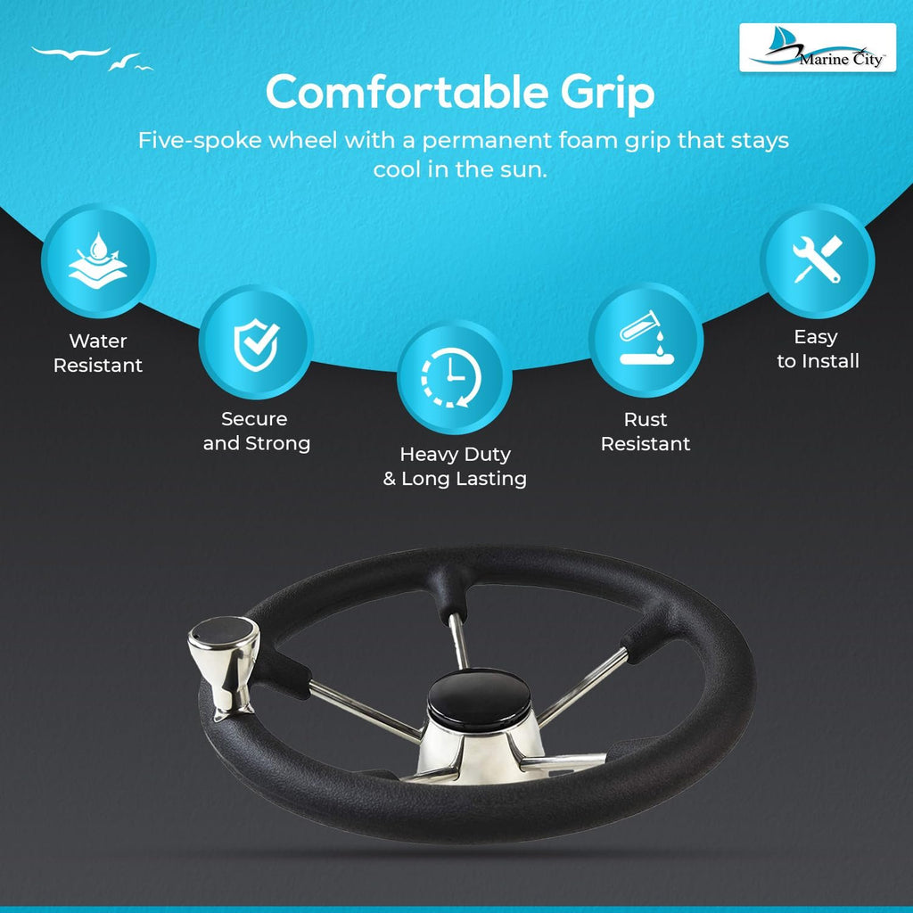 The Marine City 14” Stainless Steel Steering Wheel with PU Foam Grip is built for strength, comfort, and long-lasting marine performance. Crafted from 304-grade stainless steel, this wheel is sturdy, corrosion-resistant, and designed to withstand harsh saltwater environments. Its construction adds weight and momentum for smoother, easier steering.