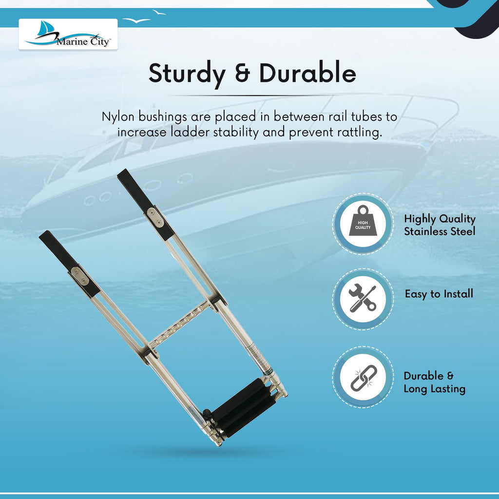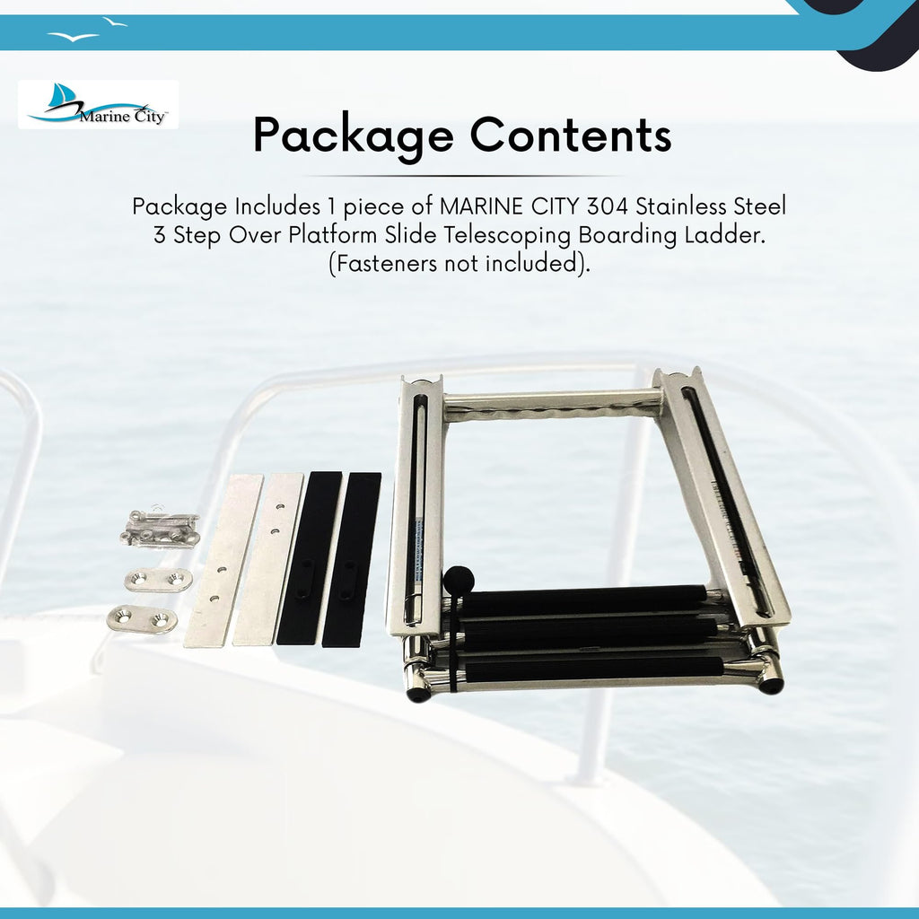 The Marine City 3-Step Telescoping Boat Ladder Over Platform Slide offers a durable, safe, and convenient solution for boarding and disembarking from boats, yachts, kayaks, and other marine vessels. Constructed from highly polished 304-grade stainless steel, this ladder provides superior corrosion and water resistance for long-lasting marine use.