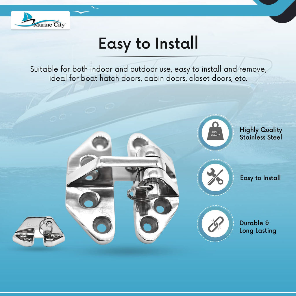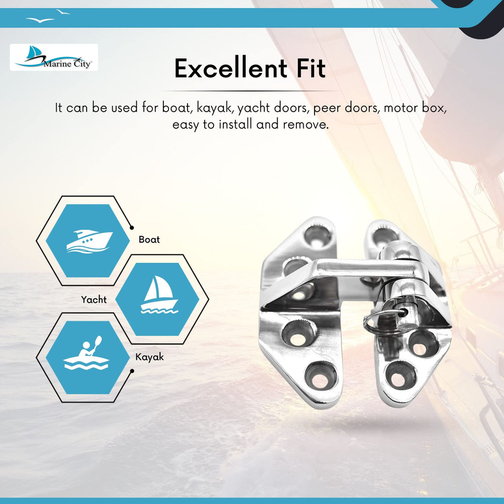 The removable pin design allows for easy installation, maintenance, and hinge removal without disassembling the entire door or hatch. Its compact size and precision engineering make it ideal for boat hatch doors, cabin doors, cabinet doors, and windows on boats, yachts, kayaks, and other marine vessels.