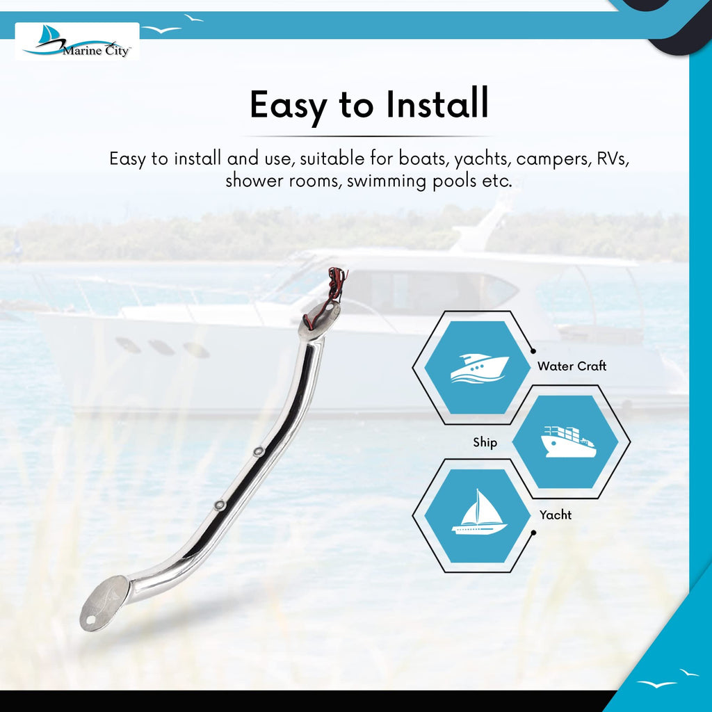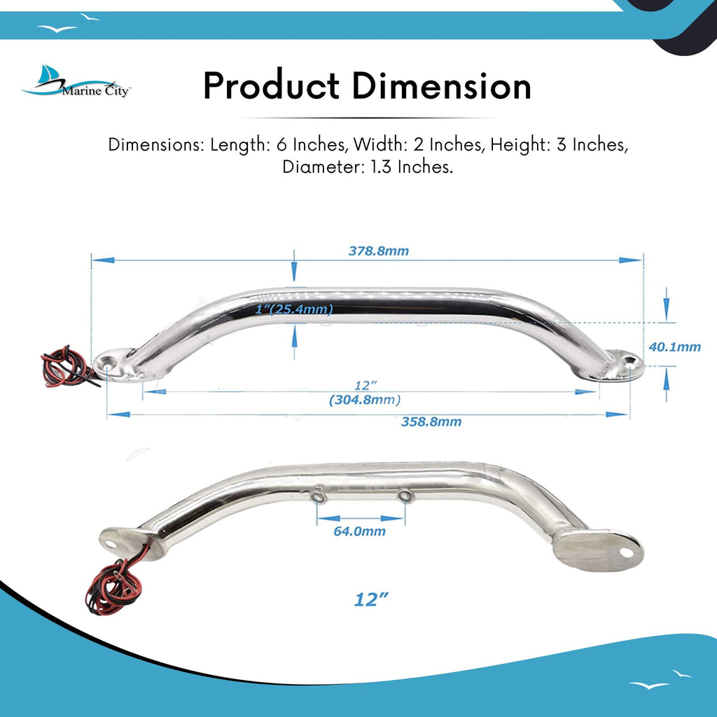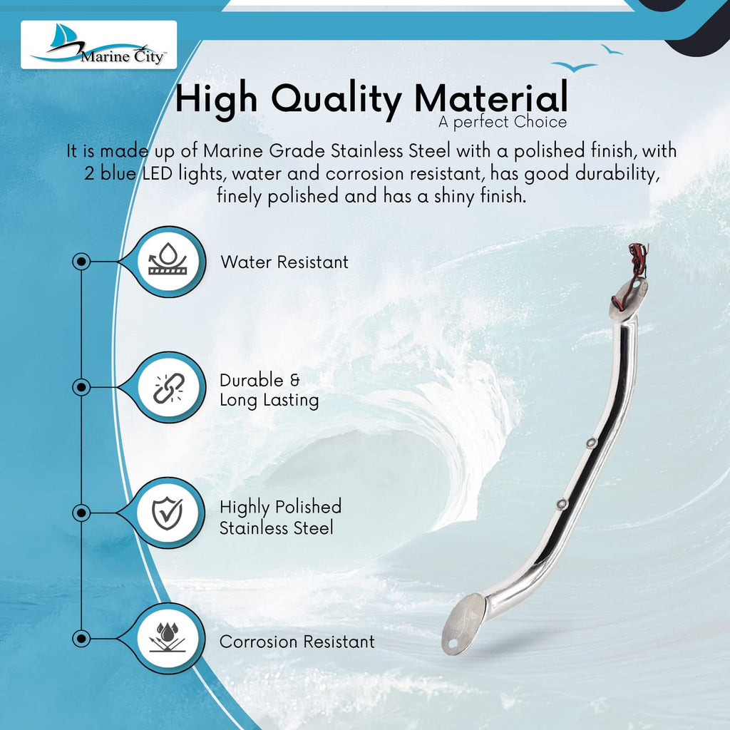 Marine City Newest Stainless Steel 9” / 12” / 16”/ 18” Grab Rail Handle with Blue 1/2 / 3 LED Lights (12” 2-LED-Lights Grab Rail Handle)
