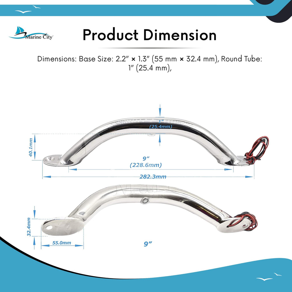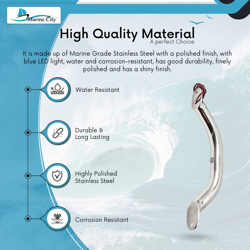 Marine City Newest Stainless Steel 9” / 12” / 16”/ 18” Grab Rail Handle with Blue 1/2 / 3 LED Lights (9” 1-LED-Light Grab Rail Handle)