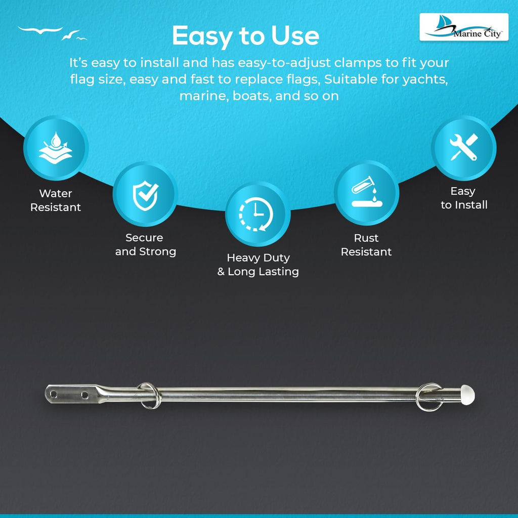 Equipped with black plastic clamps and split clips, the flag staff easily mounts on tubing ranging from 7/8" to 1", allowing quick adjustments for flag positioning. The sturdy pole ensures that your US flag flutters proudly, even at high speeds, making it perfect for yachts, boats, pontoons, RVs, and other marine vessels.