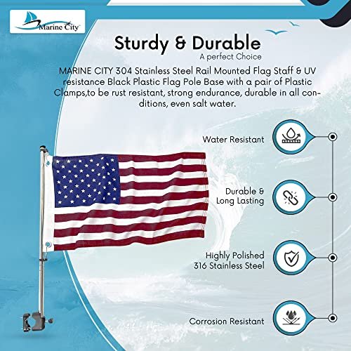 - • Asta de bandera montada en riel de acero inoxidable MARINE CITY 304 y base de asta de bandera de plástico negro resistente a los rayos UV con un par de abrazaderas de plástico, resistente a la oxidación, gran resistencia y duradera en todas las condiciones, incluso en agua salada.