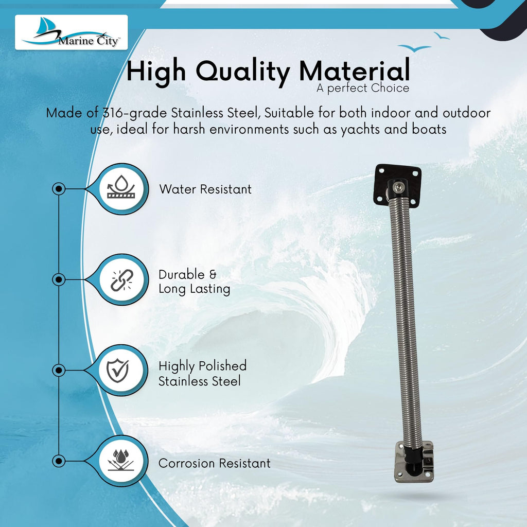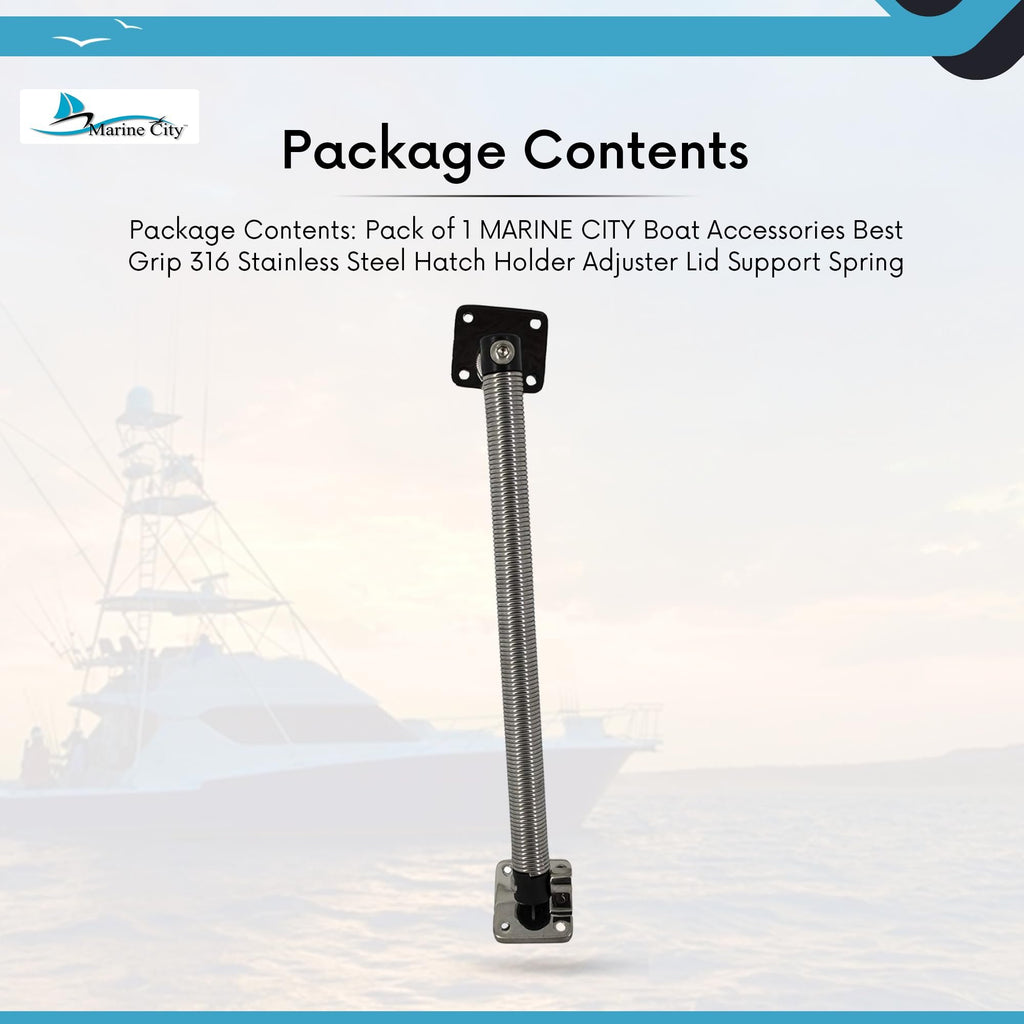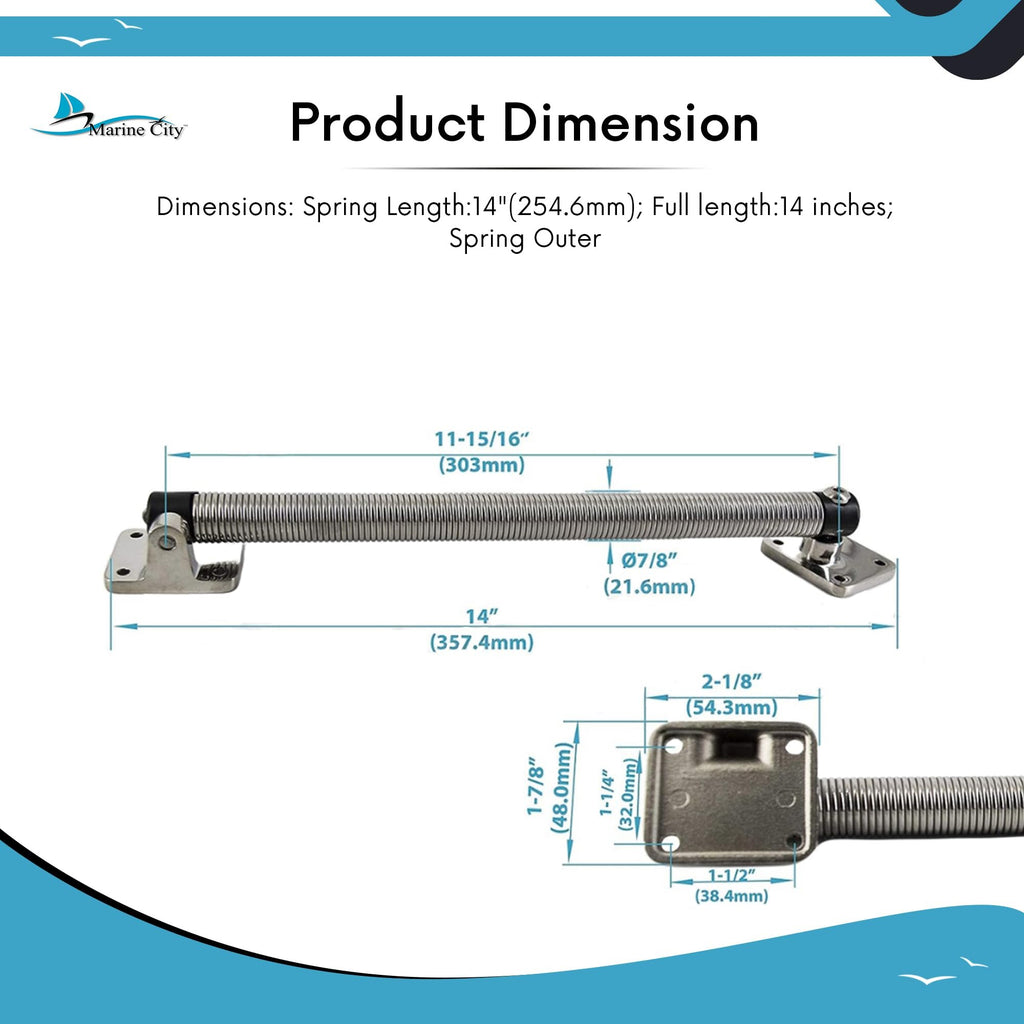 - • Dimensión: Longitud del resorte: 14"(254,6 mm); Longitud total: 14 pulgadas; Resorte exterior Contenido del paquete: 1 pieza Marine City 304 Soporte de resorte para escotilla de acero inoxidable -7/8” x 14” pulgadas.