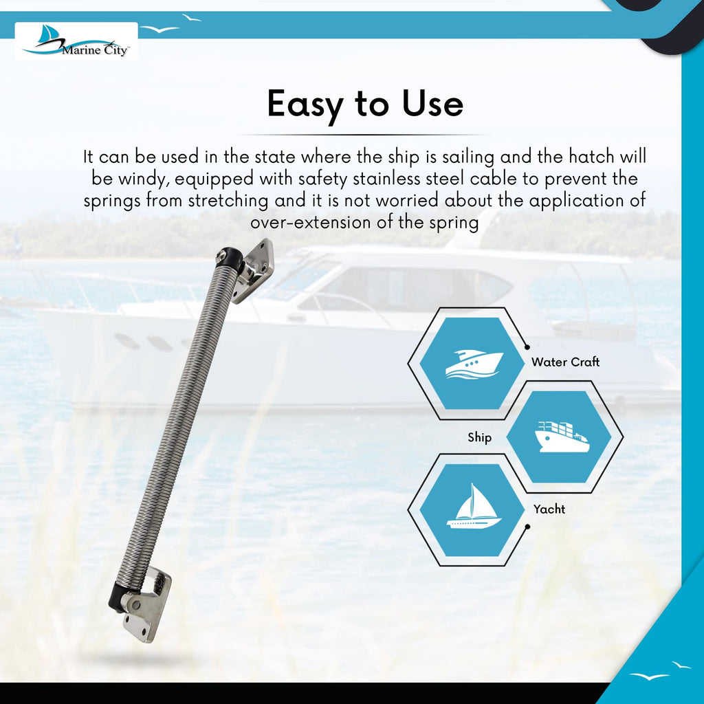 • Se puede utilizar en el estado en el que el barco navega y la escotilla tendrá viento, está equipado con un cable de seguridad de acero inoxidable para evitar que los resortes se estiren y no se preocupa por la aplicación de una extensión excesiva del resorte.
