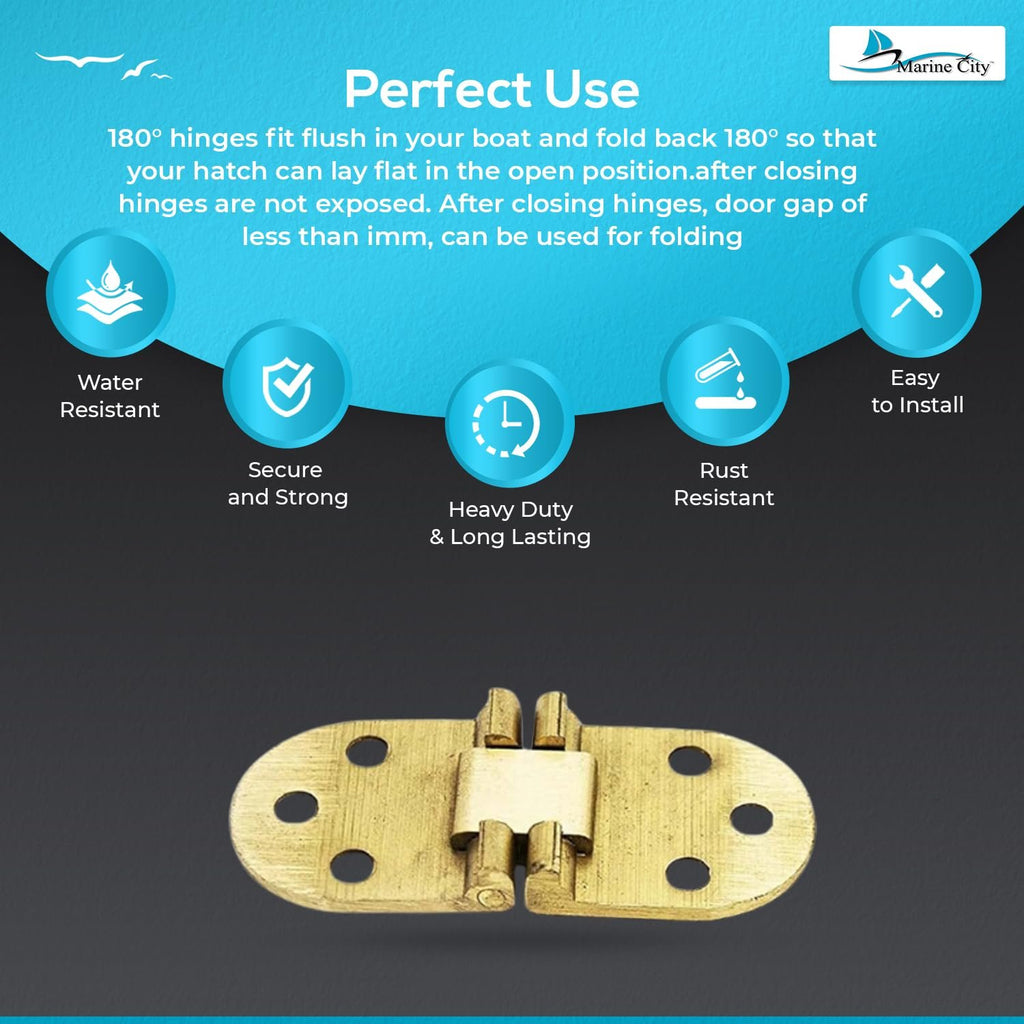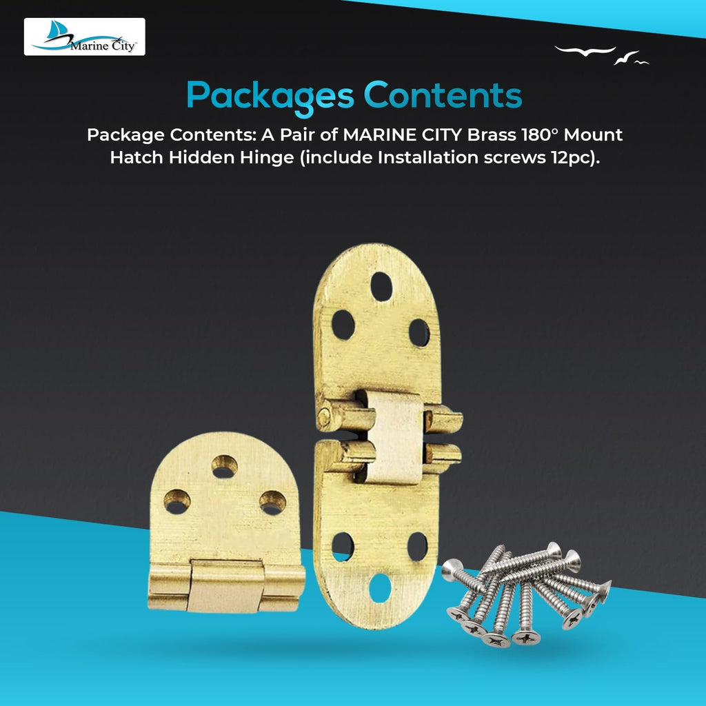 • Contenido del paquete: Un par de bisagras ocultas para escotilla de montaje de 180° de latón MARINE CITY (incluye 2 tornillos de instalación).