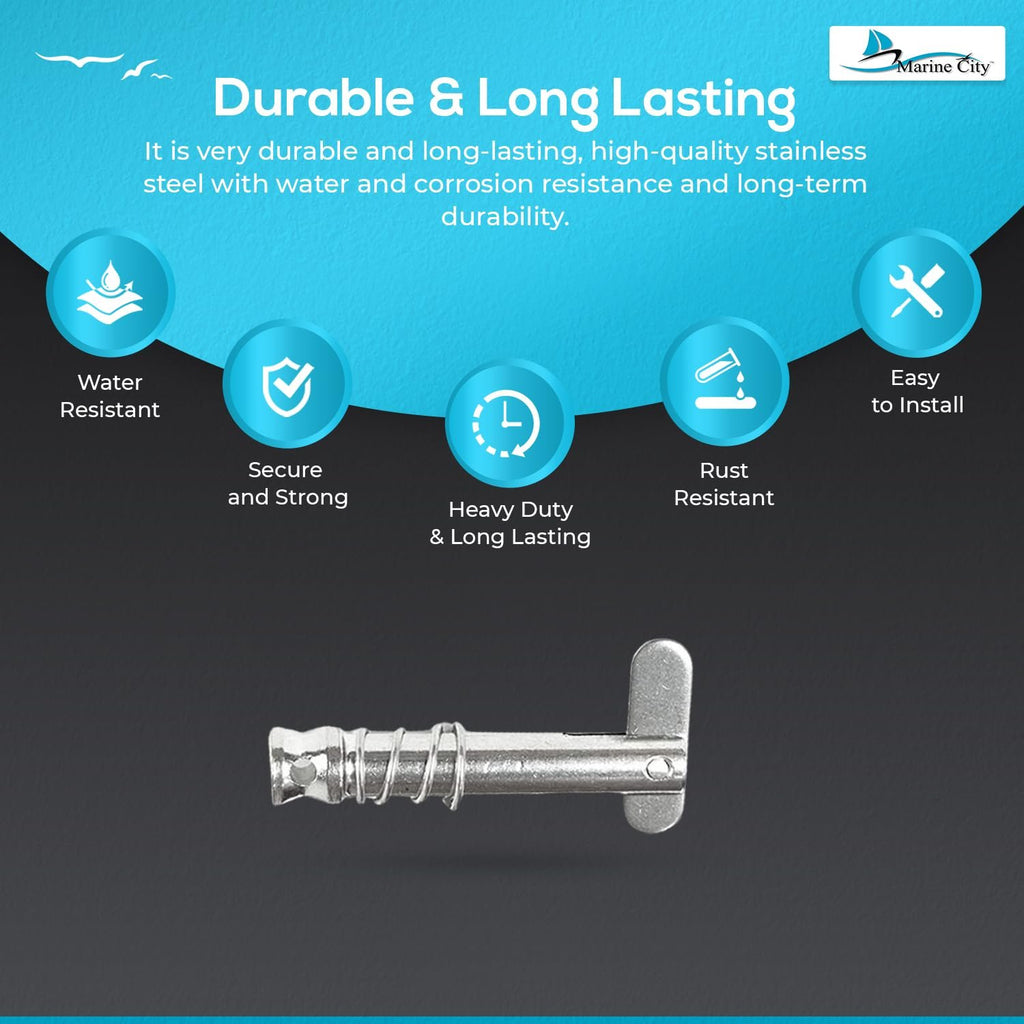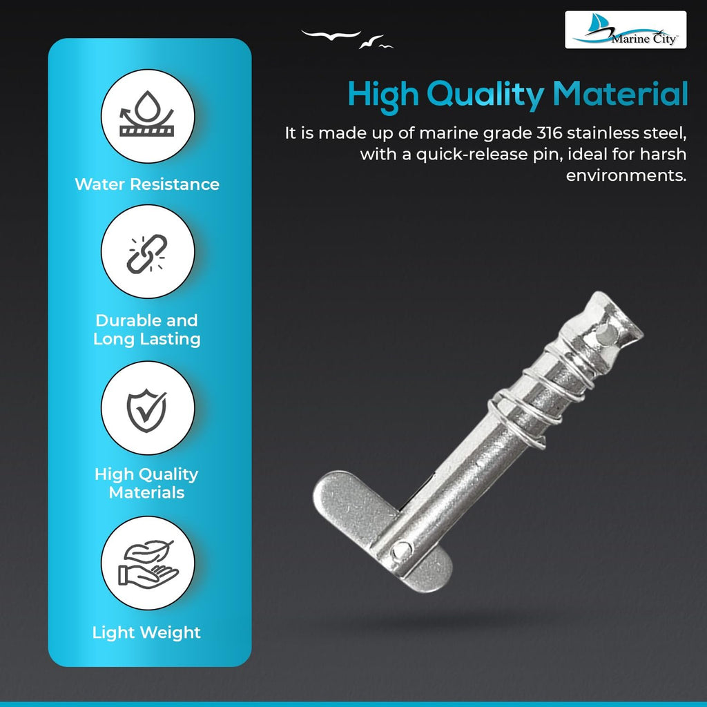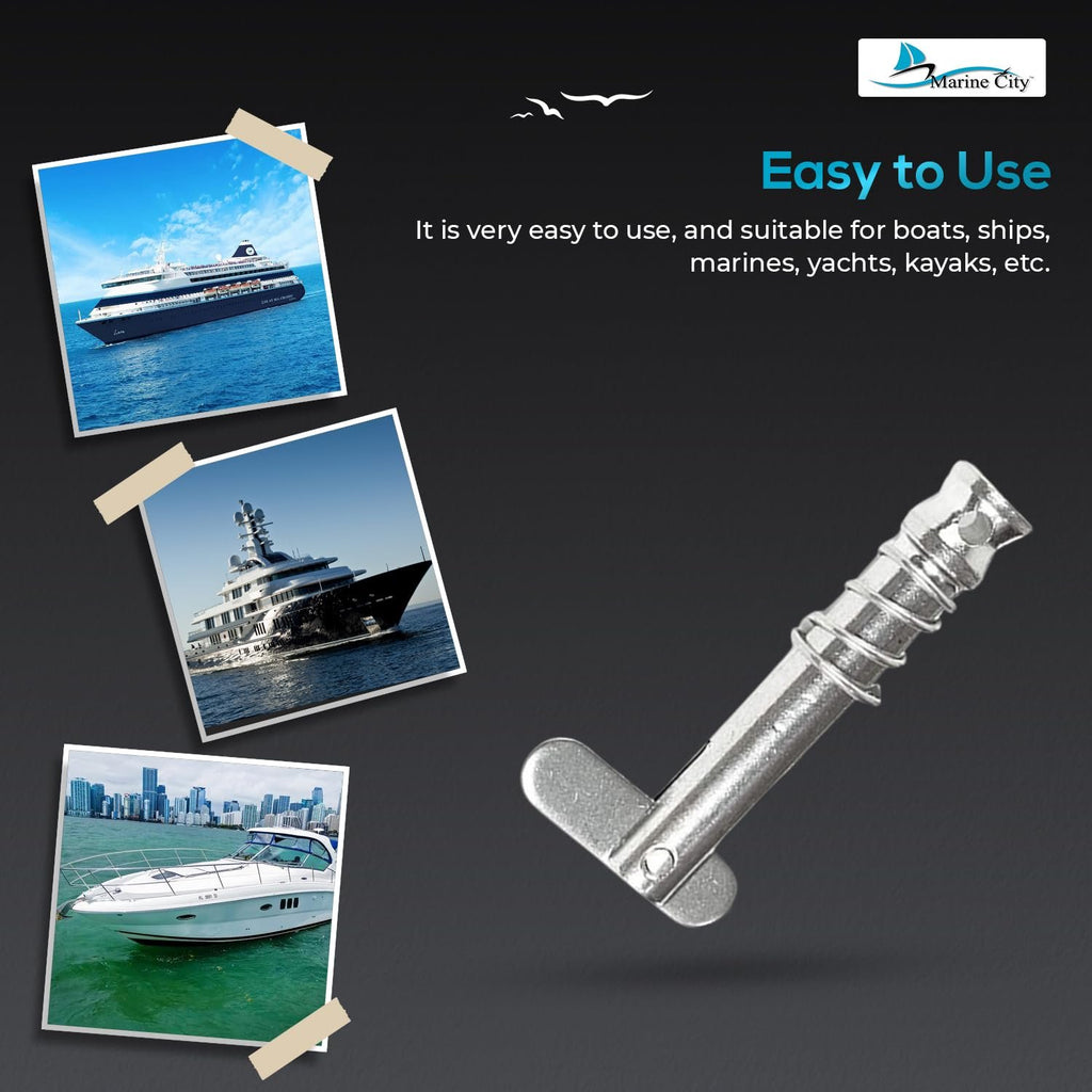 The Marine City Quick Release Pin for Bimini Tops is a high-quality marine accessory made from 316-grade stainless steel, offering exceptional durability and corrosion resistance for harsh marine conditions.