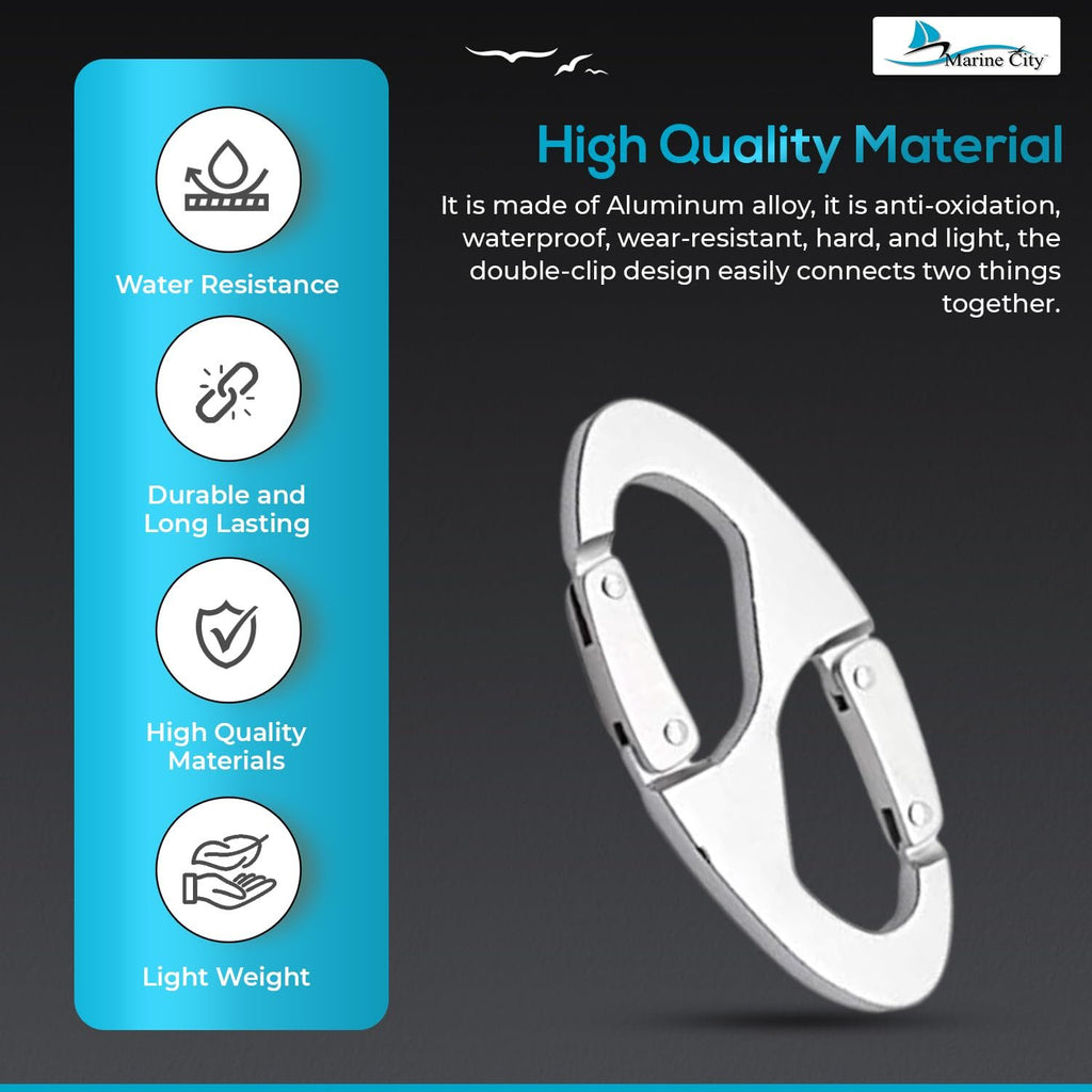 The Marine City 8-Shape Carabiner Buckle Snap Clip Hook (Pack of 2) is a versatile and lightweight solution for connecting, hanging, and organizing gear. Made from high-quality aluminum alloy, it offers excellent resistance to oxidation, water, and wear while remaining strong and easy to handle.
