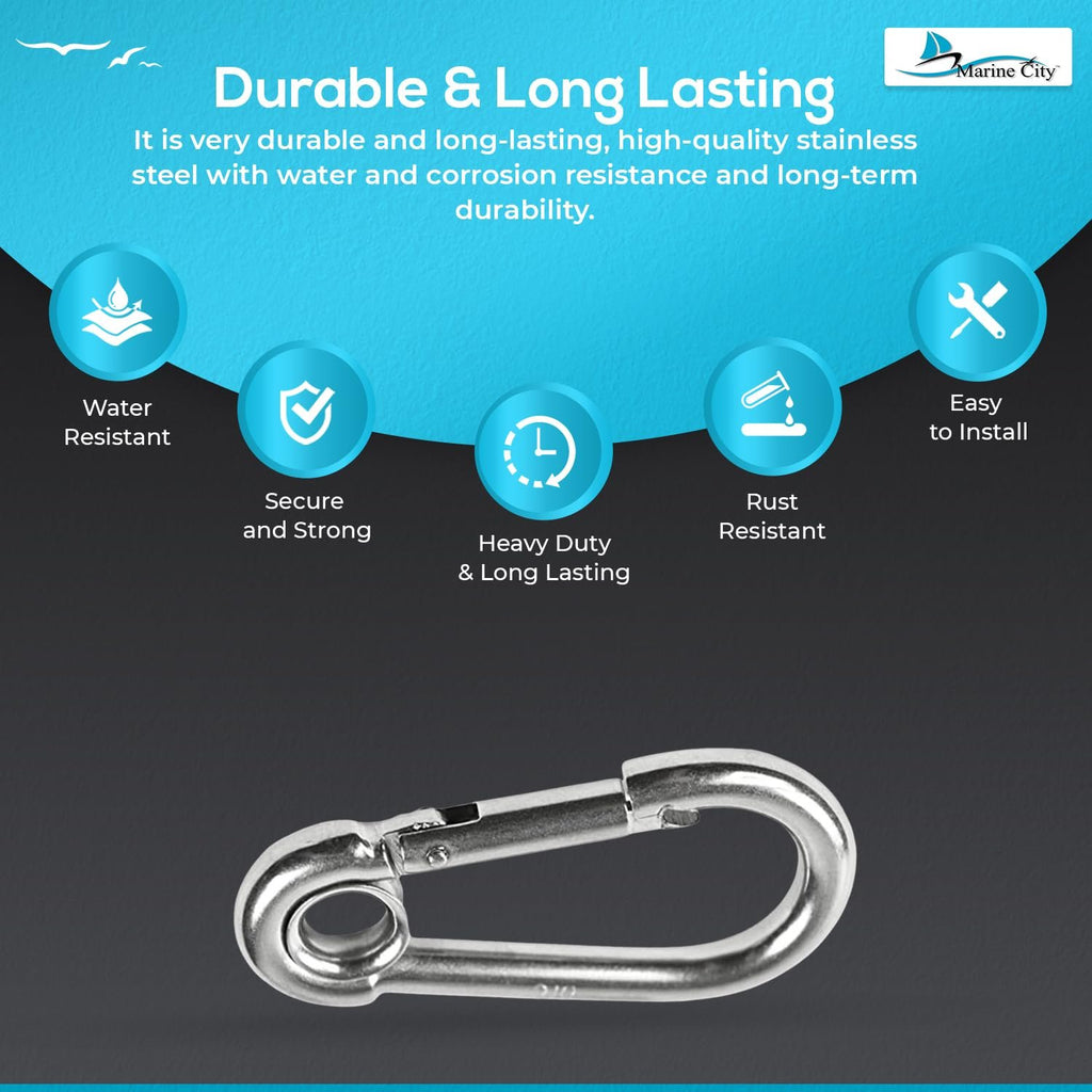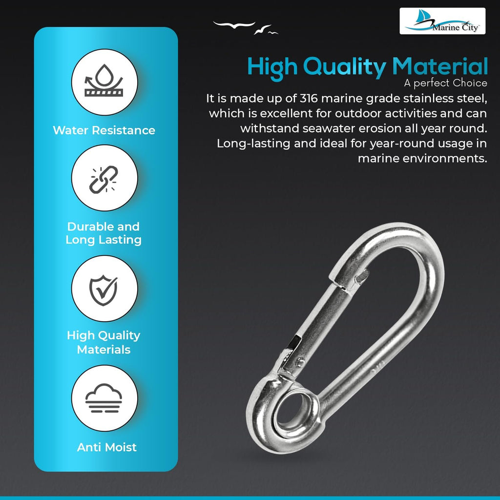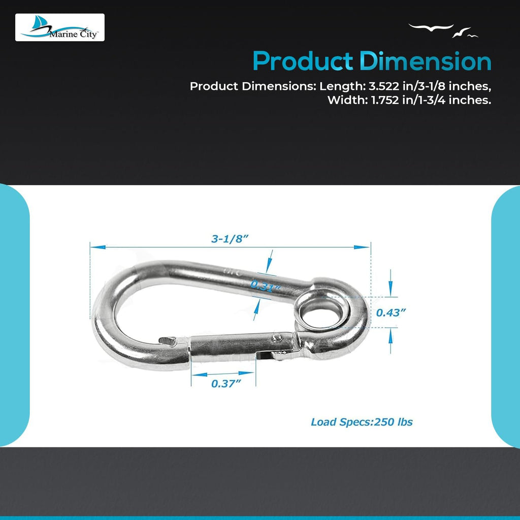 With a robust 3-1/8 inch (80.3 mm) size, these heavy-duty snap hooks are perfect for climbing, boating, sailing, fishing, camping, hiking, travel, sports, backpacks, keychains, belts, and purse straps. Dependable, economical, and built to last, this pack of 10 Marine City stainless steel carabiners offers exceptional value for indoor and outdoor use alike.