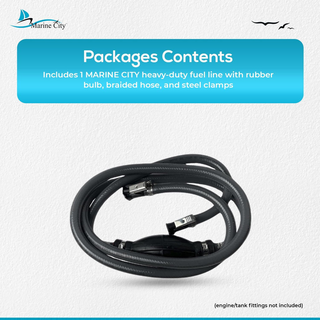 • • Contenido del paquete: 1 unidad de conjunto de línea de combustible de alta resistencia para embarcaciones MARINE CITY, línea/manguera de combustible fueraborda marina de nailon de 8,8 pies, diámetro interior de 3/8" y diámetro exterior de 5/8" para motor fueraborda con bulbo de goma de primera calidad y línea de goma trenzada de nailon Manguera y abrazaderas de acero (no incluyen accesorios de motor o tanque).