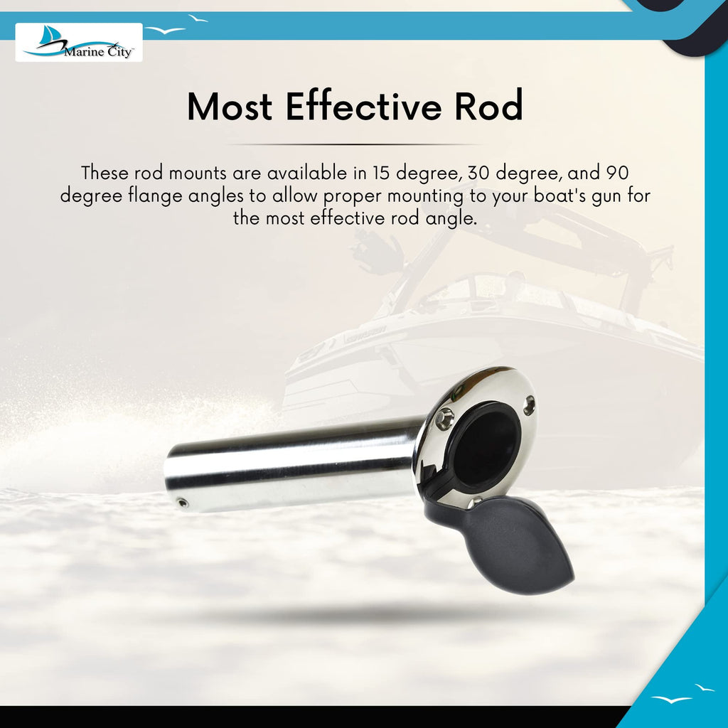 Estos soportes para cañas de alta resistencia están disponibles en ángulos de brida de 15 grados, 30 grados y 90 grados para permitir un montaje adecuado en la borda de su embarcación para obtener el mejor ángulo de caña.