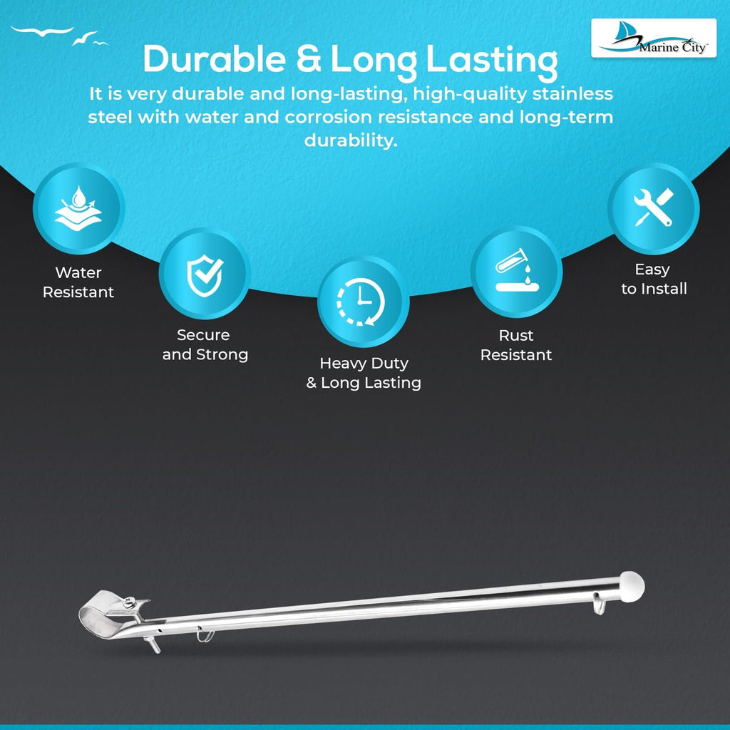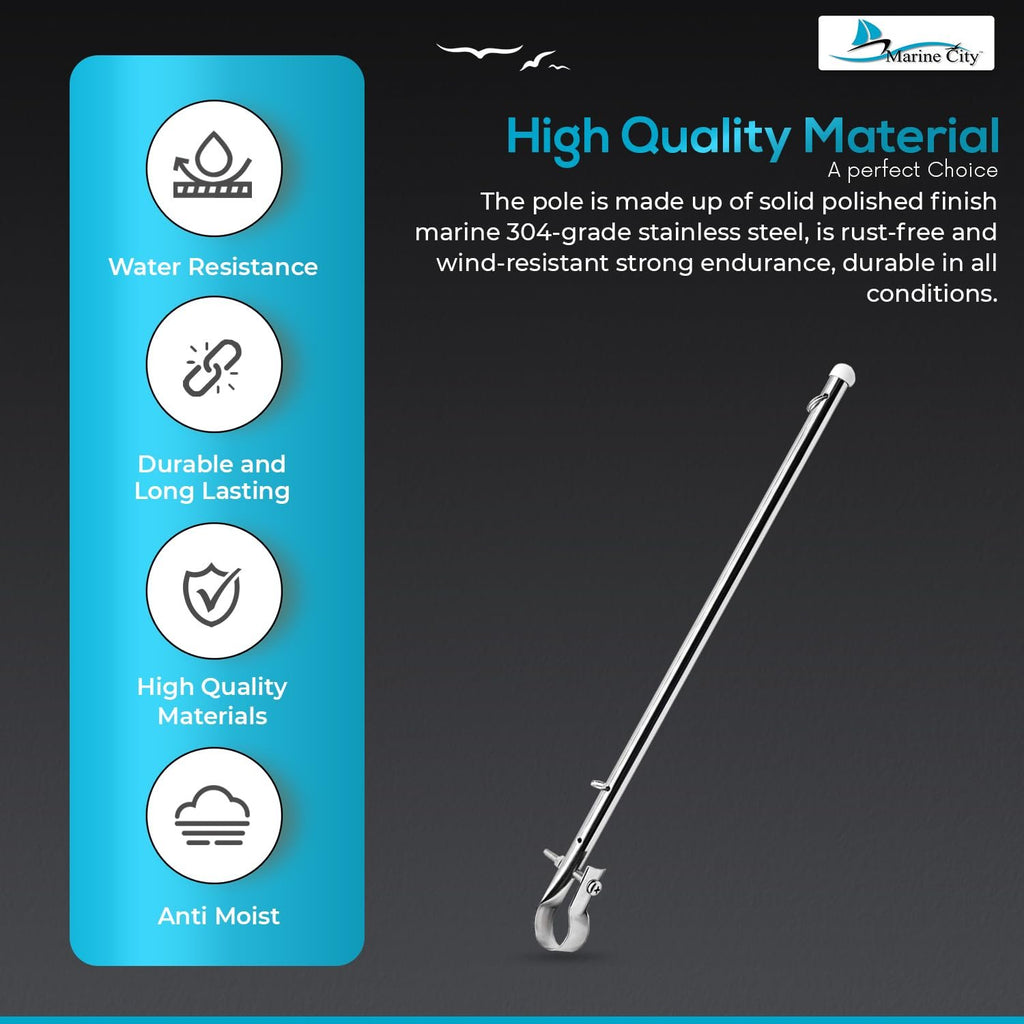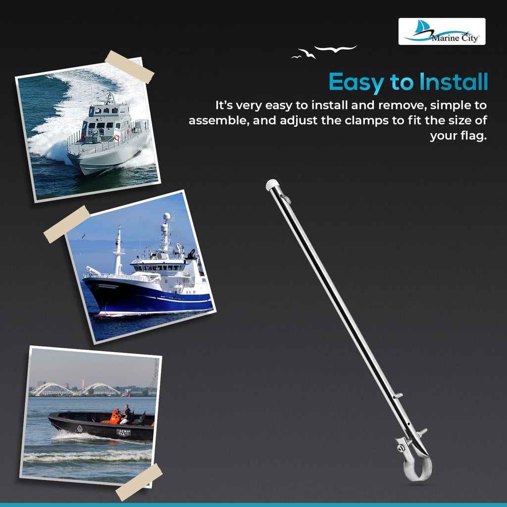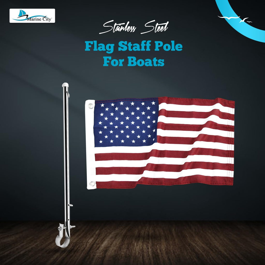 The Marine City Flagpole with 12"x18" USA Flag is a high-quality, polished 304-grade stainless steel rail mount flag staff pole designed for boats, yachts, ships, RVs, and marine vessels. Its durable construction is rust-free, wind-resistant, and strong, ensuring long-term performance in harsh marine and outdoor environments.